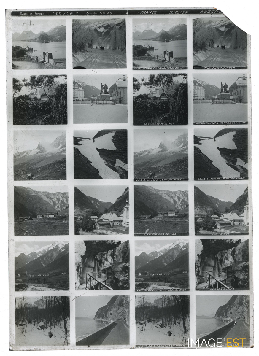 Série de 24 vues montrant des montagnes, des gorges, des lacs, des villages... en Haute-Savoie. Une mention manuscrite en haut de la plaque indique : " Made in France " Educa " - Breveté S.G.D.G France Série : 34 - Annecy ? ". Une annotation figure sous certaines vues : " Le lac d'Annecy : Talloires et Duingt - Chamonix en hiver - Le château de Duingt - Chamonix : le monument de Saussure - Les aiguilles : sentier du plan - col d'Anterne : pont de neige - chalet des fonds - vue de Sixt - vallée de Chamonix : les Houches - Gorges du Fier - Sous-bois à Servoz en hiver - Le lac du Bourget ". Il pourrait s'agir d'une plaque destinée à être visionnée dans le domaine de l'Education. (Ecole de Danne et Quatre vents (Moselle). Sur chaque plaque de verre, on trouve deux colonnes doubles de six photographies stéréoscopiques placées en rangée. Concernant les plaques stéréoscopiques, on peut s'interroger sur la nature des représentations véhiculées par l'intermédiaire de la collection la plus diffusée, à savoir la Géographie illustrée de la France. Chaque vue stéréoscopique possède sa propre légende inscrite dans la partie inférieure, et chaque plaque intègre en son milieu son numéro de série et son intitulé.(Source : Nicolas Le Guern, « La stéréoscopie dans les salles de classe. Le cas du stéréoscope Educa dans la France de l'entre-deux-guerres », Transbordeur [En ligne], 8 | 2024, mis en ligne le 15 février 2025, consulté le 28 octobre 2025. URL : http://journals.openedition.org/transbordeur/1456 ; DOI : https://doi.org/10.4000/12gy7).