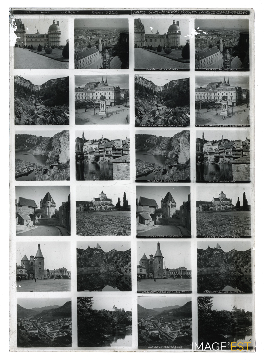 Série de 24 vues montrant : châteaux, palais ducal, place, cascade, portes fortifiées? 24 - Nevers - Issoudun - La Creuse - Clermont-Ferrand ". Une annotation figure sous certaines vues : " Château de Valençay - Nevers : le Palais Ducal - Grande cascade du Mont Dore - Clermont-Ferrand : statue de Vercingétorix - Paysage à Crozant - Vue d'Argenton - Nevers : porte de Croux - Abbaye de Fontgombault - Issoudun : porte de ville (XVIe S) - Crozant : ruines du château - Vue de la Bourboule - Château de Romefort (XIVe S) ". Il pourrait s'agir d'une plaque destinée a être visionnée dans le domaine de l'Education. (Ecole de Danne et Quatre vents (Moselle). Sur chaque plaque de verre, on trouve deux colonnes doubles de six photographies stéréoscopiques placées en rangée. Concernant les plaques stéréoscopiques, on peut s'interroger sur la nature des représentations véhiculées par l'intermédiaire de la collection la plus diffusée, à savoir la Géographie illustrée de la France. Chaque vue stéréoscopique possède sa propre légende inscrite dans la partie inférieure, et chaque plaque intègre en son milieu son numéro de série et son intitulé. (Source : Nicolas Le Guern, « La stéréoscopie dans les salles de classe. Le cas du stéréoscope Educa dans la France de l'entre-deux-guerres », Transbordeur [En ligne], 8 | 2024, mis en ligne le 15 février 2025, consulté le 28 octobre 2025. URL : http://journals.openedition.org/transbordeur/1456 ; DOI : https://doi.org/10.4000/12gy7).