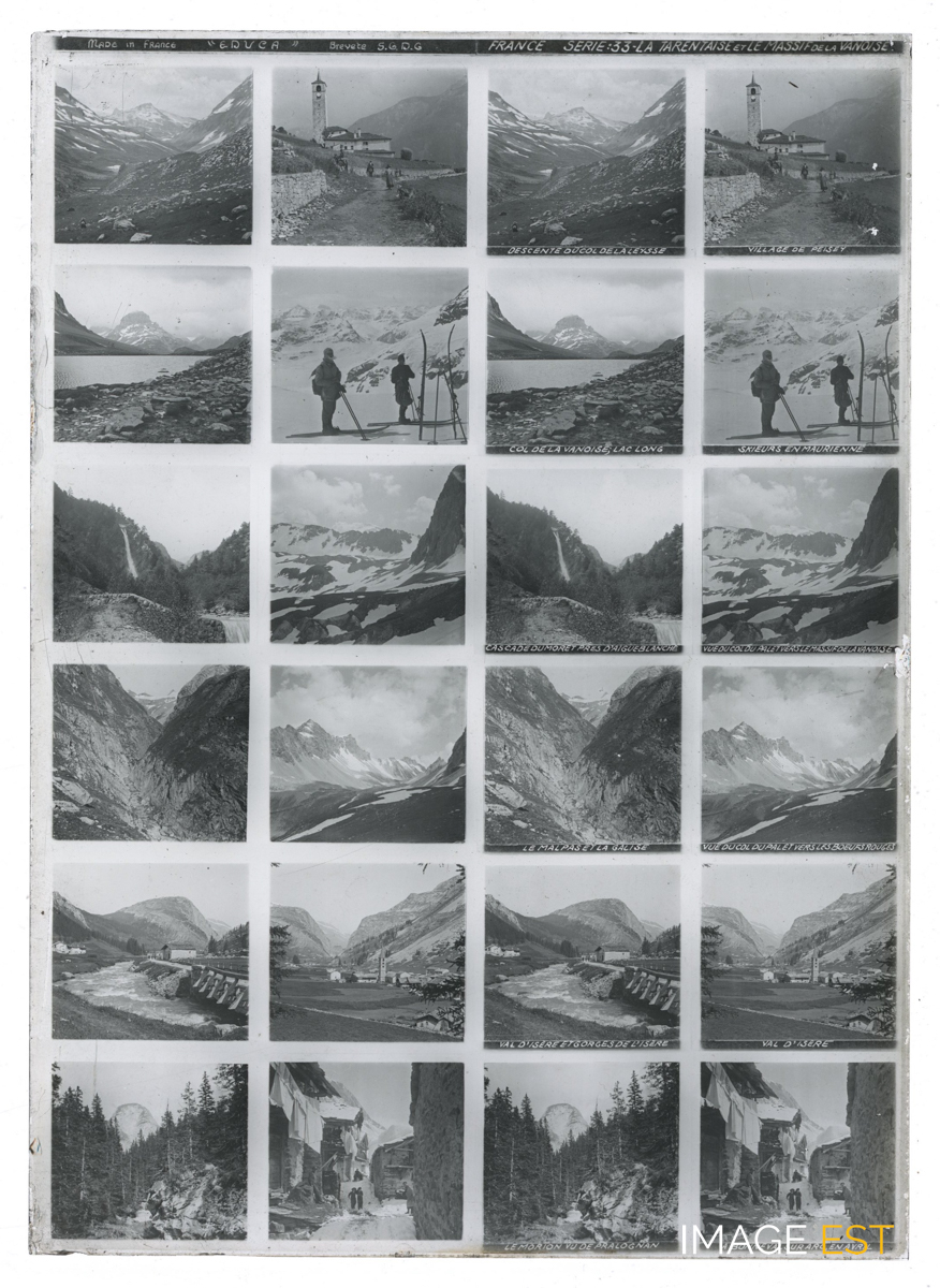 Série de 24 vues montrant : cols, massifs montagneux, villages, en tarentaise et le massif de la Vanoise. Une mention manuscrite en haut de la plaque indique : " Made in France " Educa " - Breveté S.G.D.G France Série 33 - La tarentaise et le massif de la Vanoise. Une annotation figure sous certaines vues : " Descente du col de la Leysse - Village de Peisey - Col de la Vanoise ; lac long - Skieurs en Maurienne - Cascade du Morey près d'Aigueblanche - Village du col du Palet près de la Vanoise - Le malpas et la galise - Vue du col du Pal et vers les boeufs rouges - Val d'Isère et gorges de l'Isère - Le morion vu de Pralognan - A Bonneval-sur-Arc, en avril ". Il pourrait s'agir d'une plaque destinée a être visionnée dans le domaine de l'Education. (Ecole de Danne et Quatre vents (Moselle). Sur chaque plaque de verre, on trouve deux colonnes doubles de six photographies stéréoscopiques placées en rangée. Concernant les plaques stéréoscopiques, on peut s'interroger sur la nature des représentations véhiculées par l'intermédiaire de la collection la plus diffusée, à savoir la Géographie illustrée de la France. Chaque vue stéréoscopique possède sa propre légende inscrite dans la partie inférieure, et chaque plaque intègre en son milieu son numéro de série et son intitulé. (Source : Nicolas Le Guern, « La stéréoscopie dans les salles de classe. Le cas du stéréoscope Educa dans la France de l'entre-deux-guerres », Transbordeur [En ligne], 8 | 2024, mis en ligne le 15 février 2025, consulté le 28 octobre 2025. URL : http://journals.openedition.org/transbordeur/1456 ; DOI : https://doi.org/10.4000/12gy7).