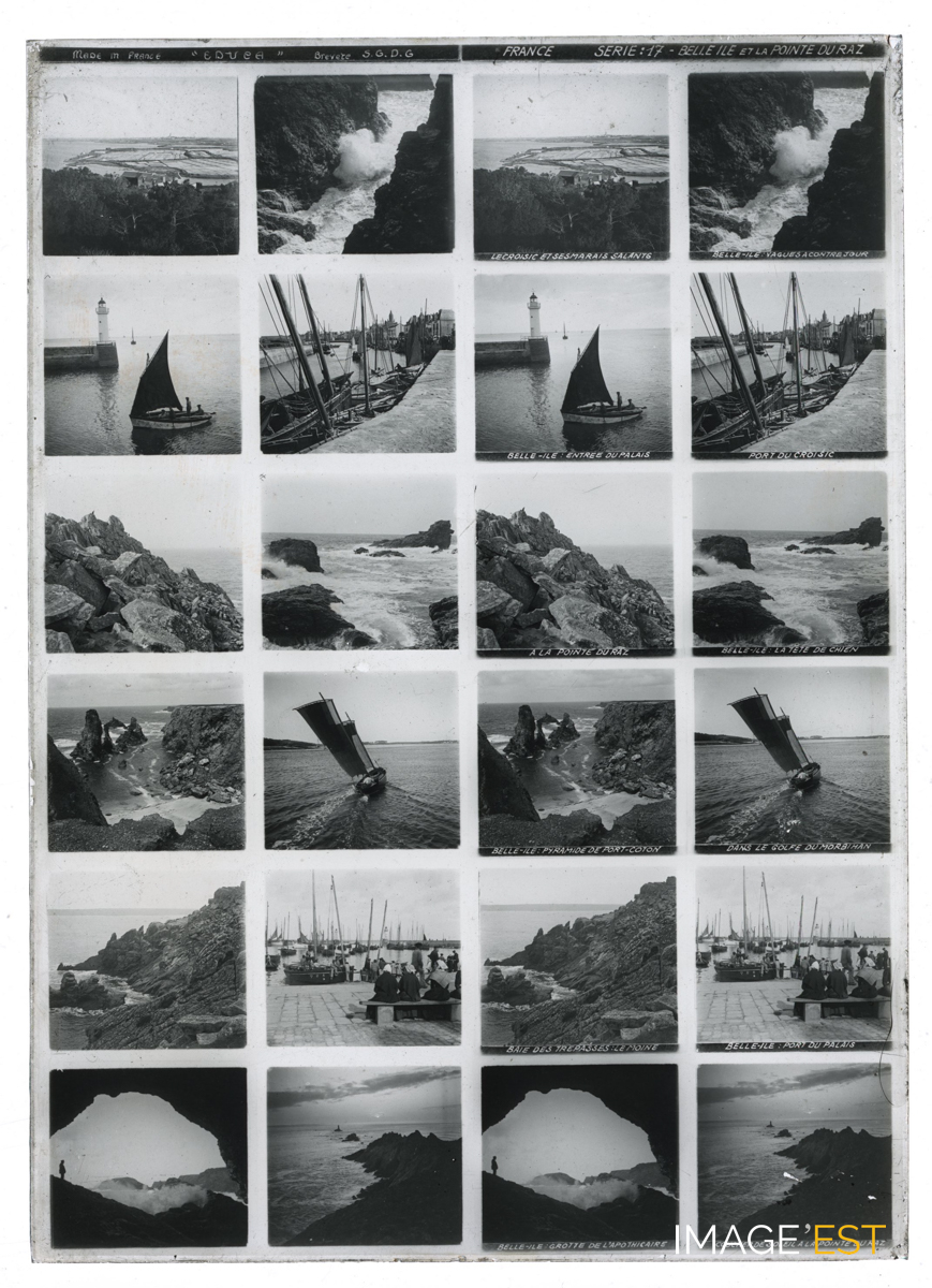 Série de 24 vues montrant des paysages maritimes, falaises (Pointe-du-raz, la tête de chien, baie des trépassés, marais salants (Le croisic), le port du Palais (Belle-Ile). Une mention manuscrite en haut de la plaque indique : " Made in France " Educa " - Breveté S.G.D.G France Série 17 - Belle-Ile et la pointe du Raz ". Une annotation figure sous certaines vues : " Le Croisic et ses marais salants - Belle-Ile : vagues à contrejour - Belle-Ile : entrée du Palais - port du Croisic - A la pointe du Raz - Belle-Ile : la tête de chien - Belle-Ile : pyramide de Port-Coton - Dans le golfe du Morbihan - Baie des trépassés : le Moine - Belle-Ile : Port du Palais - Belle-Ile : grotte de l'Apothicaire - Coucher de soleil à la pointe du Raz ". Il pourrait s'agir d'une plaque destinée a être visionnée dans le domaine de l'Education. (Ecole de Danne et Quatre vents (Moselle). Sur chaque plaque de verre, on trouve deux colonnes doubles de six photographies stéréoscopiques placées en rangée. Concernant les plaques stéréoscopiques, on peut s'interroger sur la nature des représentations véhiculées par l'intermédiaire de la collection la plus diffusée, à savoir la Géographie illustrée de la France. Chaque vue stéréoscopique possède sa propre légende inscrite dans la partie inférieure, et chaque plaque intègre en son milieu son numéro de série et son intitulé. (Source : Nicolas Le Guern, « La stéréoscopie dans les salles de classe. Le cas du stéréoscope Educa dans la France de l'entre-deux-guerres », Transbordeur [En ligne], 8 | 2024, mis en ligne le 15 février 2025, consulté le 28 octobre 2025. URL : http://journals.openedition.org/transbordeur/1456 ; DOI : https://doi.org/10.4000/12gy7).