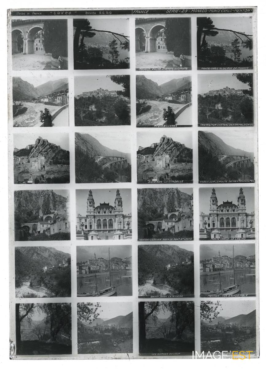 Série de 24 vues montrant des paysages et villes du Sud de la France. Une mention manuscrite en haut de la plaque indique : " Made in France " Educa " - Breveté S.G.D.G France Série : 29 - Monaco - Monte-Carlo - Menton". Une annotation figure sous certaines vues : " Monaco : église St-Dévote ; les 3 ponts - Monte-Carlo vu du roc de Monaco - Roquebillières - Cagnes/Mer : château des Grimaldi (XIe S) - Sisteron : la citadelle - Viaduc sur la route de Menton à Sospel - Menton-Caravan : ravin du pont St-Louis - Monte-Carlo : le casino - Saint-Jean de la Rivière - Menton : vue d'ensemble - Les gorges du Loup - Vue générale de Digne ". Il pourrait s'agir d'une plaque destinée a être visionnée dans le domaine de l'Education. (Ecole de Danne et Quatre vents (Moselle). Sur chaque plaque de verre, on trouve deux colonnes doubles de six photographies stéréoscopiques placées en rangée. Concernant les plaques stéréoscopiques, on peut s'interroger sur la nature des représentations véhiculées par l'intermédiaire de la collection la plus diffusée, à savoir la Géographie illustrée de la France. Chaque vue stéréoscopique possède sa propre légende inscrite dans la partie inférieure, et chaque plaque intègre en son milieu son numéro de série et son intitulé.(Source : Nicolas Le Guern, « La stéréoscopie dans les salles de classe. Le cas du stéréoscope Educa dans la France de l'entre-deux-guerres », Transbordeur [En ligne], 8 | 2024, mis en ligne le 15 février 2025, consulté le 28 octobre 2025. URL : http://journals.openedition.org/transbordeur/1456 ; DOI : https://doi.org/10.4000/12gy7).