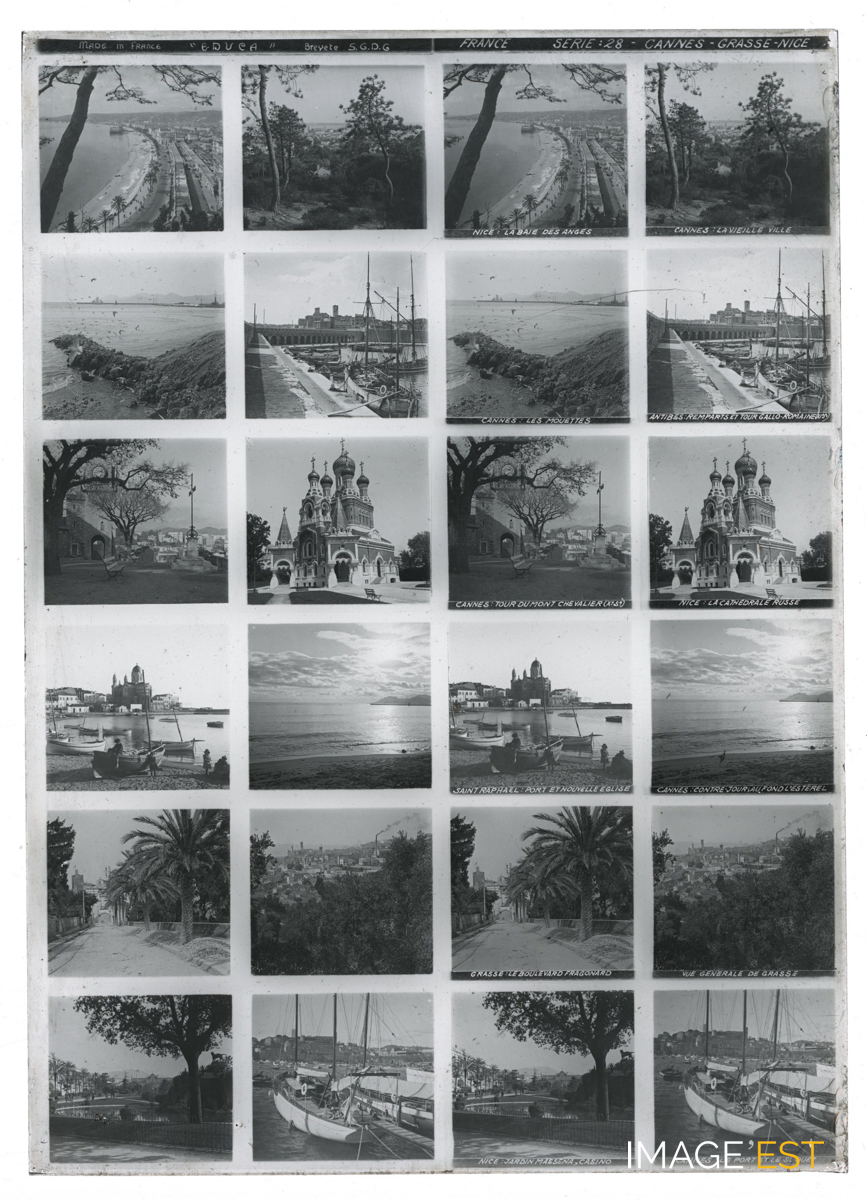 Série de 24 vues montrant des paysages et villes du Sud de la France. Une mention manuscrite en haut de la plaque indique : " Made in France " Educa " - Breveté S.G.D.G France Série : 28 - Cannes - Grasse - Nice ". Une annotation figure sous certaines vues : " Nice : la baie des anges - Cannes : la vieille ville - Cannes : les mouettes - Antibes : remparts et tour gallo-romaine (XIe S) - Cannes : tour du Mont Chevalier (Xe S) - Nice : la cathédrale russe - Saint-Raphaël : port et nouvelle église - Cannes : contre-jour ; au fond l'Esterel - Grasse : le boulevard Fragonard - vue générale de Grasse - Nice : jardin Massena, casino - Cannes : le port et le suquet ". Il pourrait s'agir d'une plaque destinée à être visionnée dans le domaine de l'Education. (Ecole de Danne et Quatre vents (Moselle). Sur chaque plaque de verre, on trouve deux colonnes doubles de six photographies stéréoscopiques placées en rangée. Concernant les plaques stéréoscopiques, on peut s'interroger sur la nature des représentations véhiculées par l'intermédiaire de la collection la plus diffusée, à savoir la Géographie illustrée de la France. Chaque vue stéréoscopique possède sa propre légende inscrite dans la partie inférieure, et chaque plaque intègre en son milieu son numéro de série et son intitulé.(Source : Nicolas Le Guern, « La stéréoscopie dans les salles de classe. Le cas du stéréoscope Educa dans la France de l'entre-deux-guerres », Transbordeur [En ligne], 8 | 2024, mis en ligne le 15 février 2025, consulté le 28 octobre 2025. URL : http://journals.openedition.org/transbordeur/1456 ; DOI : https://doi.org/10.4000/12gy7).