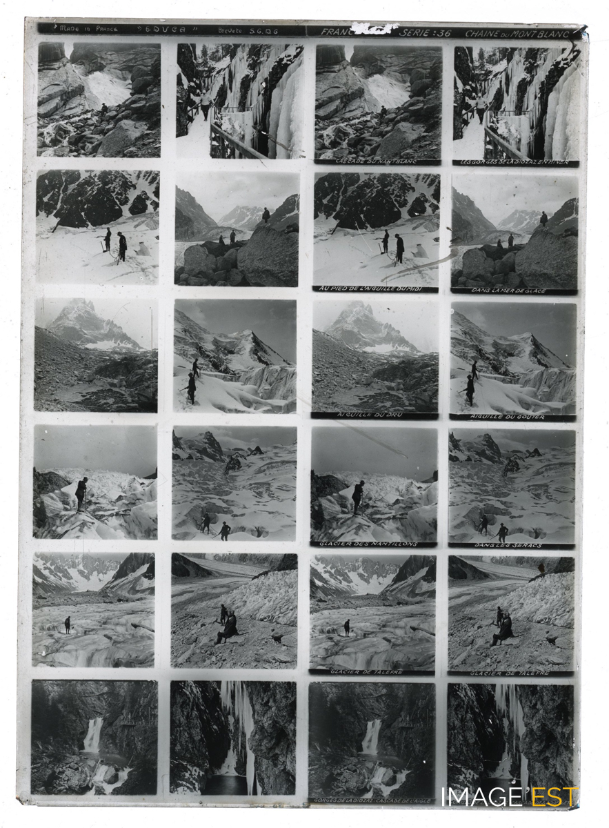 Série de 24 vues montrant : glaciers, cascades, gorges situés dans le massif du Mont Blanc (74). Une mention manuscrite en haut de la plaque indique : " Made in France " Educa " - Breveté S.G.D.G France Série 36 Chaîne du Mont Blanc ". Une annotation figure sous certaines vues : " Cascade du Nant Blanc - Les gorges de la Diozaz en hiver - Au pied de l'aiguille du midi - Dans la mer de glace - Aiguille du Dru - Aiguille du goûter - Glacier des nantillons - Dans les séracs - Dans le Talefère - Glacier de Talefère - Gorges de la Diozaz : cascade de l'aigle - Gorges de la Diozaz : cascade des soufflets ". On peut remarquer les randonneurs escaladant les glaciers sans équipement de montagne. Il pourrait s'agir d'une plaque destinée a être visionnée dans le domaine de l'Education. (Ecole de Danne et Quatre vents (Moselle). Sur chaque plaque de verre, on trouve deux colonnes doubles de six photographies stéréoscopiques placées en rangée. Concernant les plaques stéréoscopiques, on peut s'interroger sur la nature des représentations véhiculées par l'intermédiaire de la collection la plus diffusée, à savoir la Géographie illustrée de la France. Chaque vue stéréoscopique possède sa propre légende inscrite dans la partie inférieure, et chaque plaque intègre en son milieu son numéro de série et son intitulé.(Source : Nicolas Le Guern, « La stéréoscopie dans les salles de classe. Le cas du stéréoscope Educa dans la France de l'entre-deux-guerres », Transbordeur [En ligne], 8 | 2024, mis en ligne le 15 février 2025, consulté le 28 octobre 2025. URL : http://journals.openedition.org/transbordeur/1456 ; DOI : https://doi.org/10.4000/12gy7).