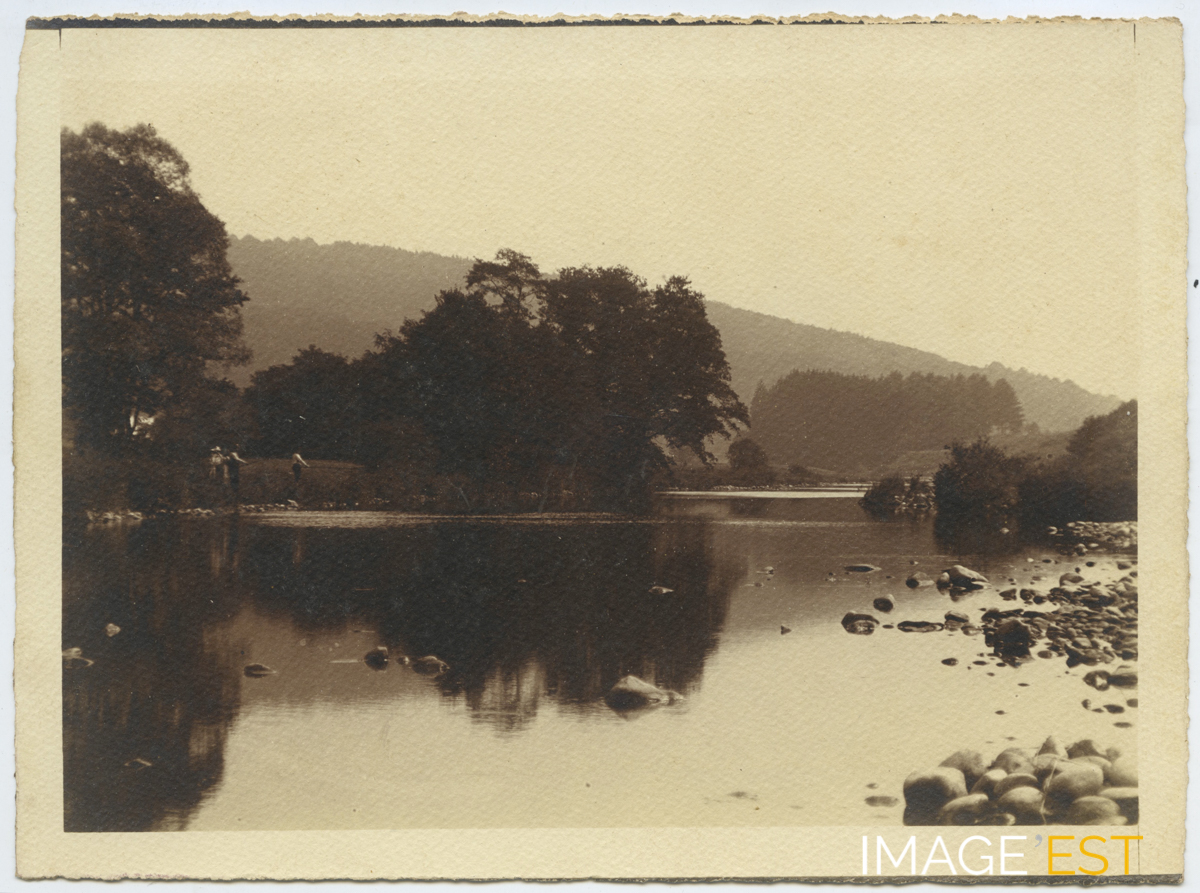 Pêcheurs au bord d'un cours d'eau probablement dans le département des Vosges. Cette photographie est extraite d'un album en cuir repoussé comprenant un ensemble de 48 photographies (format 13 x 18 cm), noir et blanc, illustrant les loisirs et la vie d'une famille aisée probablement dans le département des Vosges à la fin du XIXe ou au début du XXe siècle.