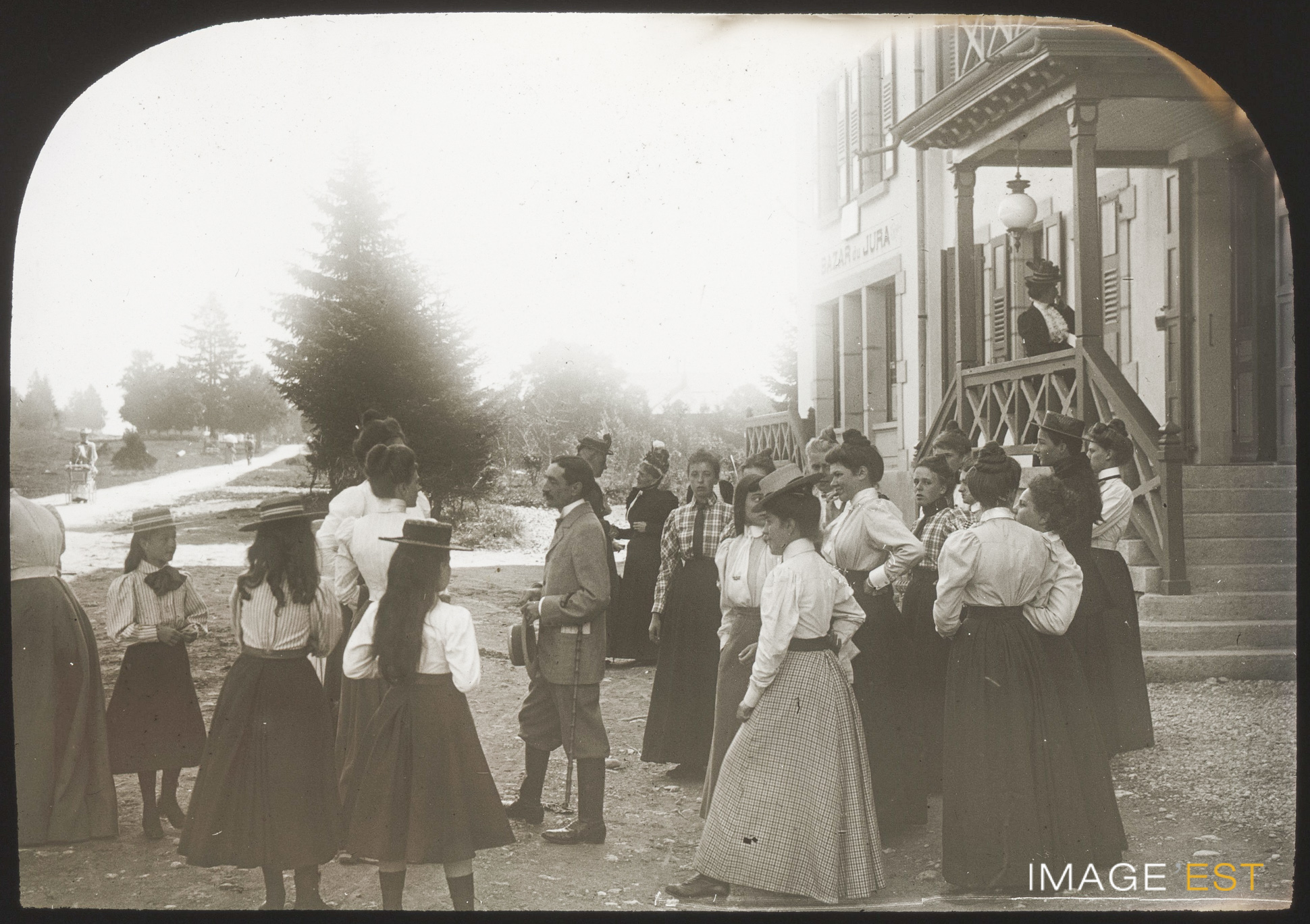 Visiteurs et élèves devant le pensionnat anglais des Rasses (Suisse). Une mention manuscrite en marge de la plaque de verre indique : " Les Rasses. Groupe d'anglaises. "