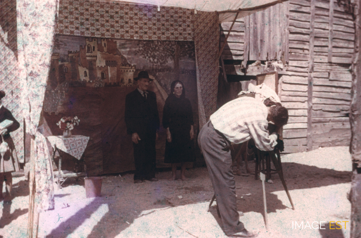 Les petits métiers. Un couple posant devant le décor du photographe. Séries de diapositives sélectionnées et commentées par Jean Hurstel, directeur du Service éducatif des Musées de l'Académie de Nancy-Metz.