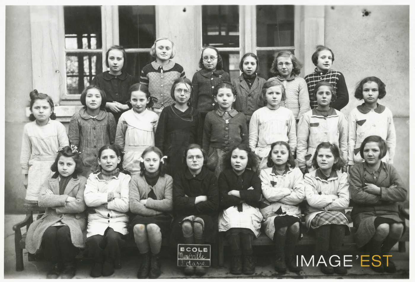 Photographie d'une classe d'élèves de 3e à Maxéville (Meurthe-et-Moselle). Devant un petit écriteau : " École Maxéville 3è classe ".