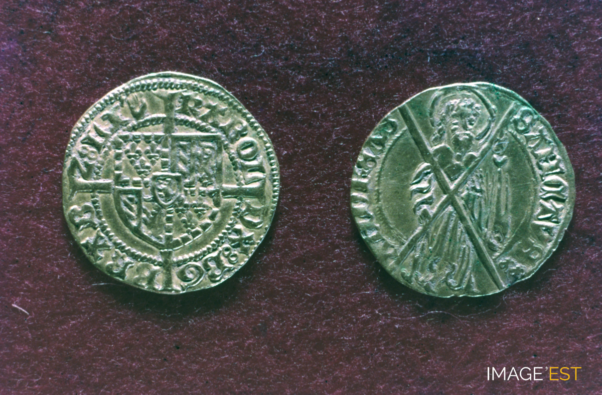 La bataille de Nancy (1477). Florins du duché de Bourgogne retrouvés en 1864 lors de l'asséchement de l'étang Saint-Jean. En marge de la diapositive figure la mention : " 6. Florin d'or bourguignon. Dernier tiers du XVe siècle. Étang St Jean de Nancy ". Séries de diapositives sélectionnées et commentées par Jean Hurstel, directeur du Service éducatif des Musées de l'Académie de Nancy-Metz.