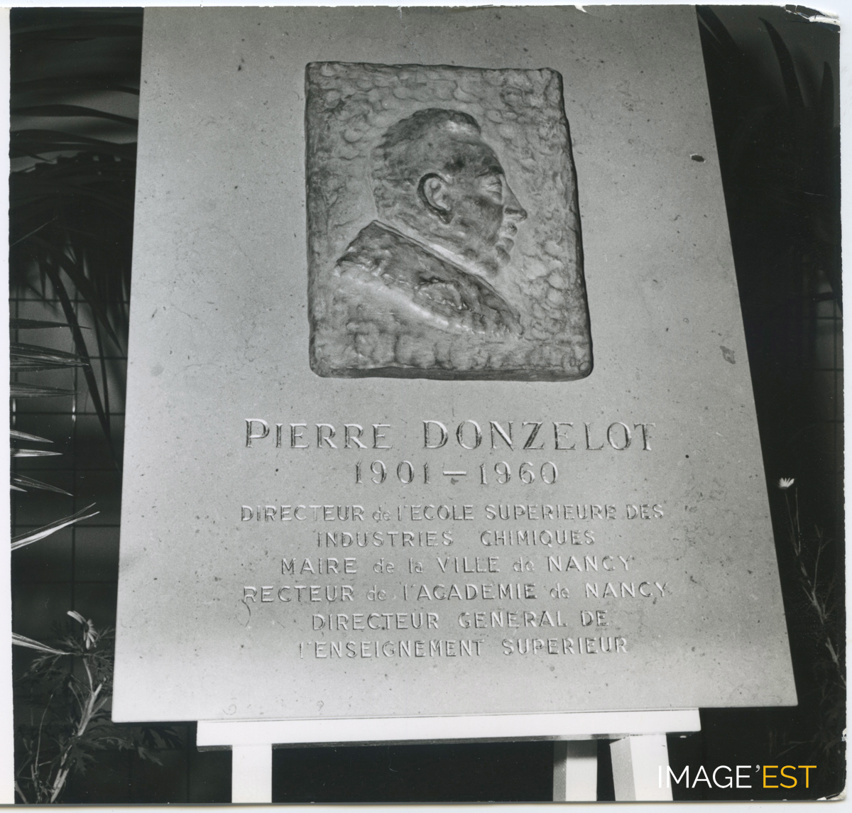 Plaque commémorative en hommage à Pierre Donzelot (1901-1960) à l'occasion de l'inauguration du nouvel amphithéâtre Pierre Donzelot de l'École nationale supérieure des industries chimiques, rue Déglin à Nancy (Meurthe-et-Moselle). Pierre Donzelot (1901-1960) a été directeur de l'École nationale supérieure des industries chimiques de Nancy, maire de la Ville de Nancy de 1945 à 1946, recteur de l'Académie des Sciences, directeur général de l'Enseignement supérieur.