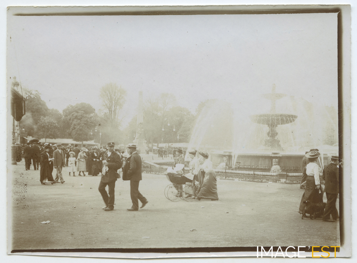 Promeneurs sur la place Carnot autour de l'ancienne fontaine et de l'obélisque, lors de la foire de mai à Nancy (Meurthe-et-Moselle) en mai 1904. Une mention manuscrite au verso de cette photographie précise : " J.Z. N° 368 - mai 1904 - 6A - E ". Vue de stands à l'arrière-plan.