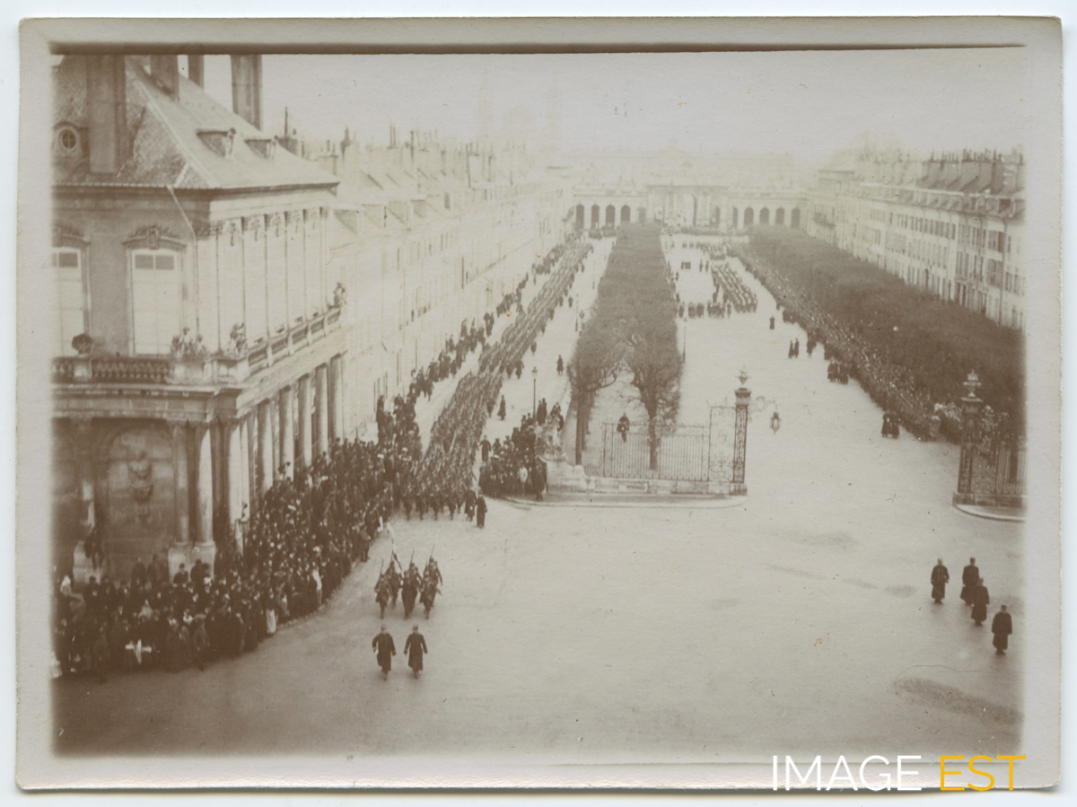 Revue militaire du colonel Guy Hugot-Derville sur la place de la Carrière à Nancy (Meurthe-et-Moselle) le 16 janvier 1904. Une mention manuscrite au verso de cette photographie précise : " J.Z. N° 327 - 16 Janvier 1904 - Revue (des decorations) - Le 69e avançant pour le défilé - En tete le colonel Hugot-Derville - l'escorte du drapeau - le 1er bataillon - (Le 2e bataillon sous les arbres coté est pépinière - se formant pour suivre le 1er - Le 3e bat. sous les arbres du coté de St Evre - E - 52 ". Vue depuis l'ancien palais du Gouverneur.