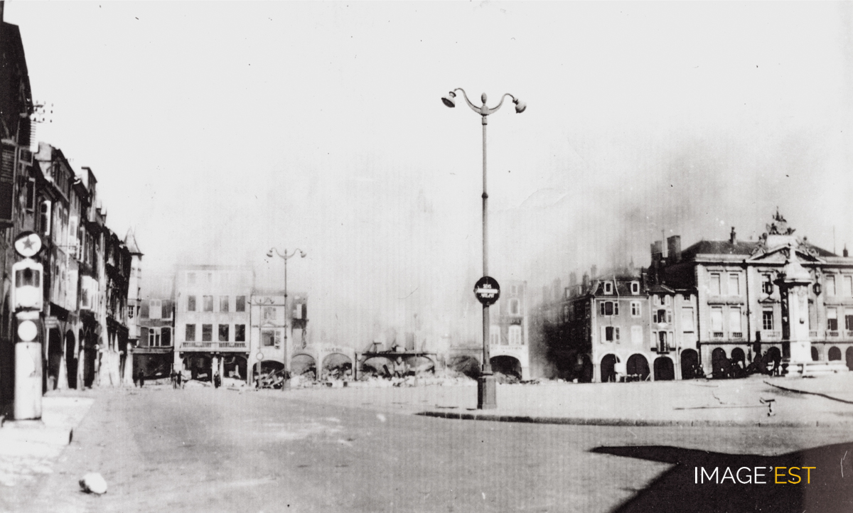La place Duroc lors des bombardements de Pont-à-Mousson (Meurthe-et-Moselle) en septembre 1944.