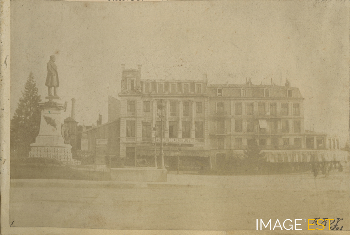 La place Thiers à Nancy (Meurthe-et-Moselle) en 1892 avant la construction des Magasins Réunis photographiée par Félix Roy (1862-1930). Il existe dans les collections du Musée lorrain (Nancy), la plaque négative 13 x 18 cm de cette photographie (Numéro d'inventaire : 2019.0.2529, n° du cliché photographique : B 646).
