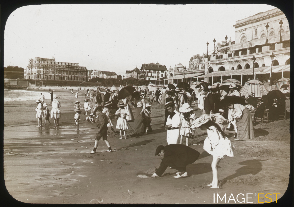 Sur la plage de Biarritz (Pyrénées-Atlantiques). En marge de la plaque de verre figure la mention : " Collection R. des Robert ". R. des Robert a été membre de la Société lorraine de photographie (1894-1914) dès 1894. Une mention manuscrite en marge de la plaque de verre indique : " La plage de Biarritz ".