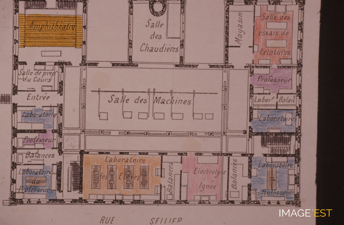 Plan des bâtiments de l'E.N.S.I.C. (École nationale supérieure des industries chimiques à Nancy (Meurthe-et-Moselle) rue Sellier.