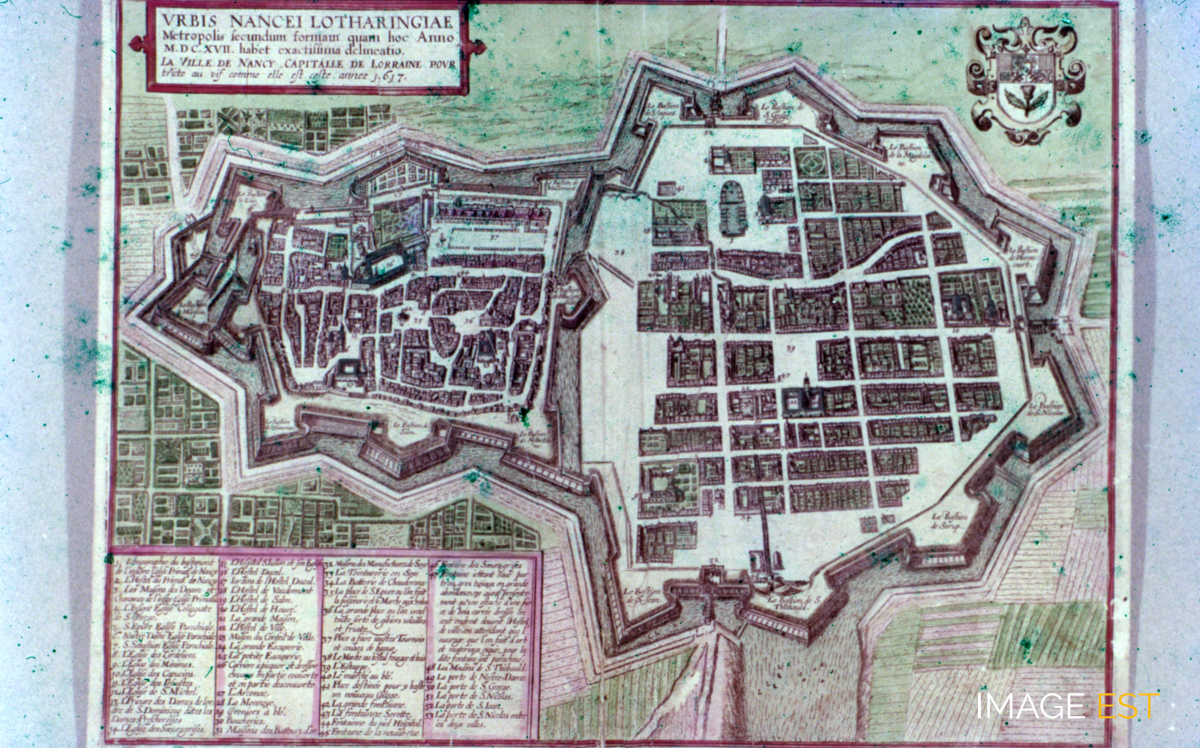 La Lorraine et la guerre de Trente ans. Plan des deux villes-fortes de Nancy (1617). En marge de la diapositive figure la mention : " 3. Plan des deux villes-fortes de Nancy (1617) ". Séries de diapositives sélectionnées et commentées par Jean Hurstel, directeur du Service éducatif des Musées de l'Académie de Nancy-Metz.