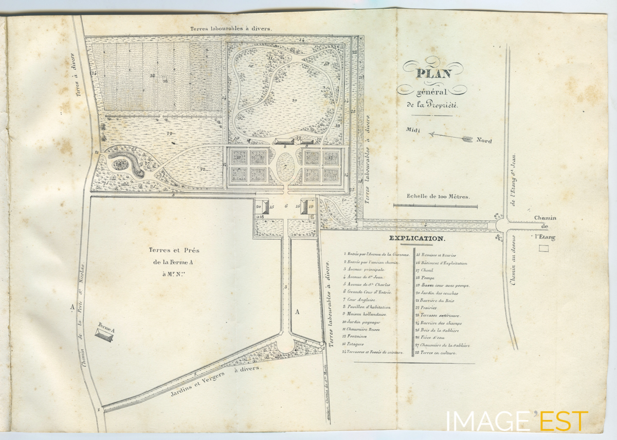 Illustration légendée " Plan général de la propriété " extraite d'une brochure intitulée " Fragments d'une habitation de la ville et de campagne près de Nancy " à Nancy (Meurthe-et-Moselle). Cette brochure comprend un avis de location d'une " jolie Maison de campagne de Sainte-Marie, à une demi-lieue de Nancy ". Il s'agit de l'ancienne propriété du parc Sainte-Marie couvrant 10 hectares, partagés prairies, bois, terres arables, jardins à l'anglaise, etc. La maison principale contenait " dix lits de maîtres, sept lits de domestiques, services de table, cristaux, procelaines, batterie de cuisine, etc." et disposait également d'écuries et d'un chenil.