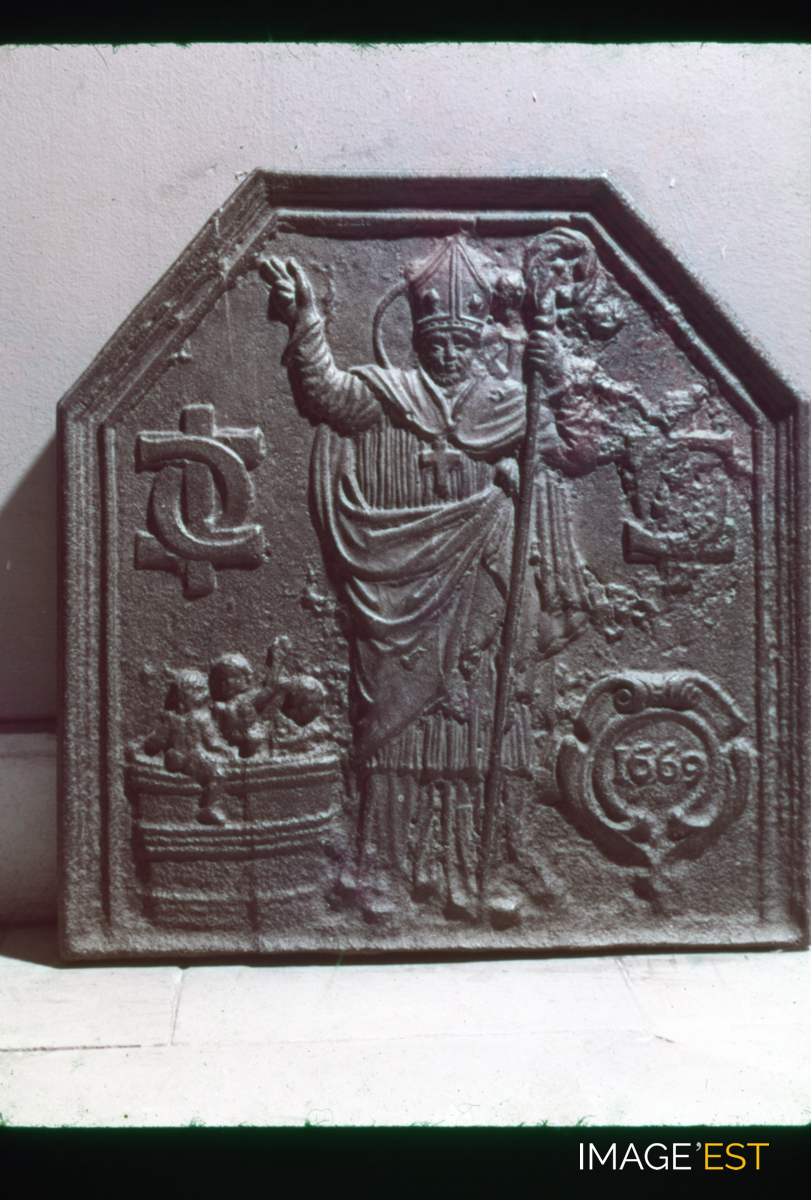 Plaque de cheminée, représentant Saint-Nicolas, saint patron de la Lorraine, et les trois petits enfants, exposée au Musée lorrain. En marge de la diapositive figure la mention : " 9 - Plaque de cheminée en fonte : " Saint Nicolas ", 1669 ". Séries de diapositives sélectionnées et commentées par Jean Hurstel, directeur du Service éducatif des Musées de l'Académie de Nancy-Metz.