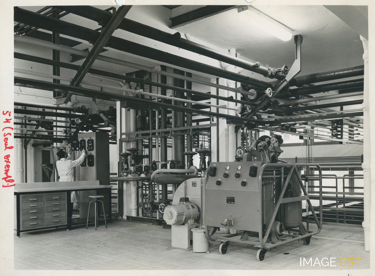 Installations techniques de l'École nationale supérieure des industries chimiques (ENSIC) à Nancy (Meurthe-et-Moselle). Cachet du photographe " Charles André Nancy n°2 2951 ". Une mention manuscrite au verso précise " Hall du génie chimique - Vue partielle d'une plateforme de travail avec son poste de régulation ".