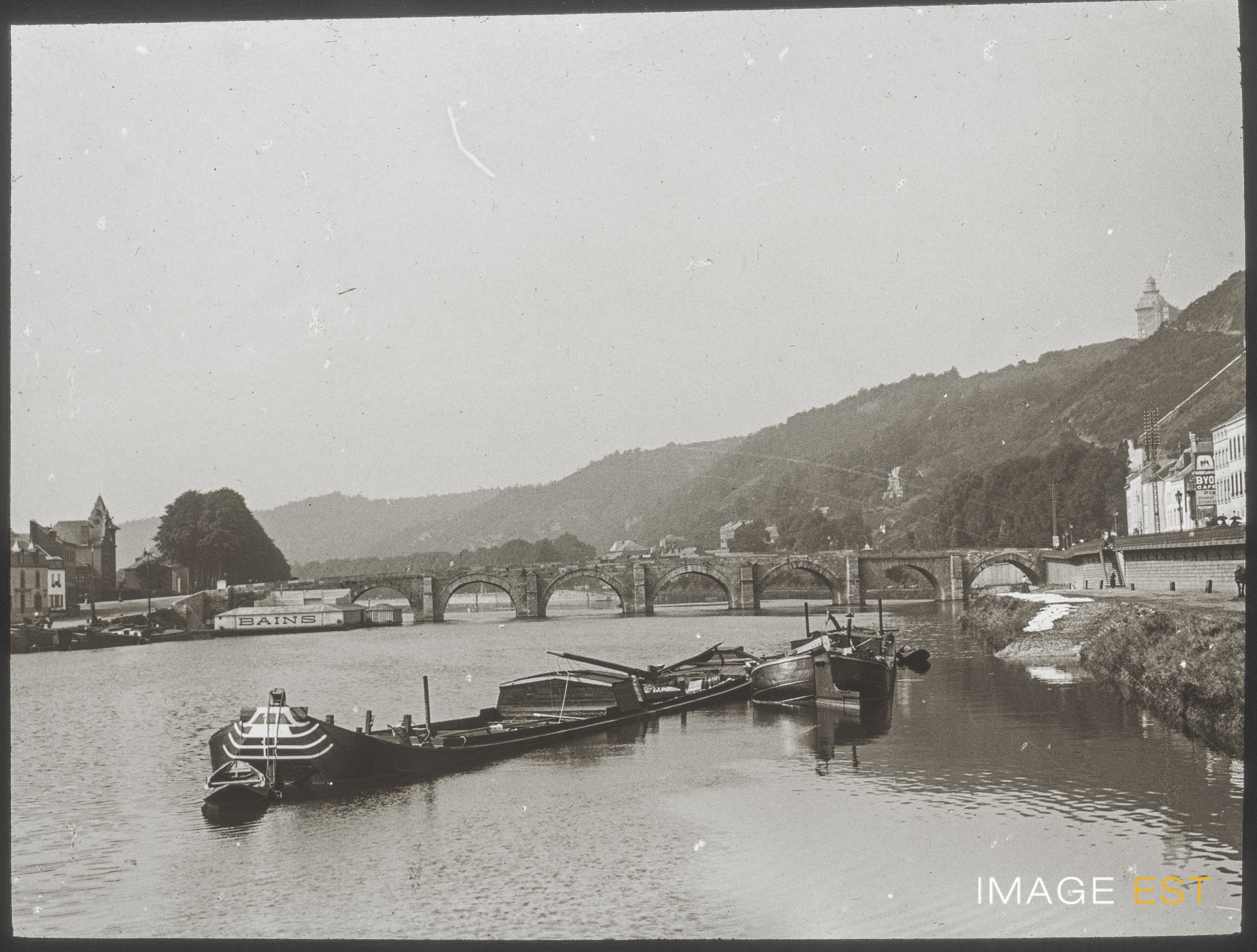 Péniches et pont de Jambes à Namur (Belgique). Une mention manuscrite en marge de la plaque de verre indique : " Namur. Le pont Romain sur la Meuse. " À gauche l'établissement des Bains.