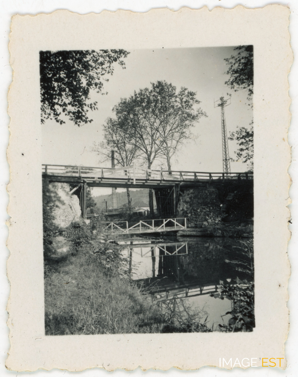 Premier pont sur le canal de la Marne au Rhin et passerelle au ras de l'eau à Maxéville (Meurthe-et-Moselle) qui seront détruits par les Allemands à la Libération. Au verso, une annotation indique : " R.-M.- Kanal?.ein Maxeville ".