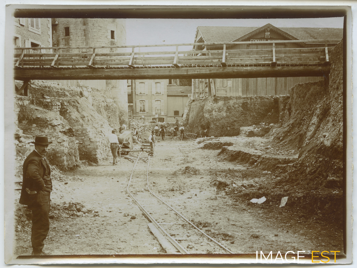 Démolitions au niveau de la tour ouest de la porte de la Craffe à Nancy (Meurthe-et-Moselle), le 3 mai 1906. Une mention manuscrite au verso de cette photographie précise : " 649 - 3 mai 1906 - La première fouille creusée dans le massif du réduit (entre les portes et le mur de l'ancien boulevard, au niveau du bas de la rue de la Craffe - au fond, coupure dans le mur du rempart - 3 - 11 - 44 ". Entre le pied de la tour ouest et l'ancien gymnase municipal, des ouvriers s'activent à la démolition d'un mur du rempart pour l'ouverture d'une brèche sur la rue de la Craffe. Présence d'une voie ferrée et de wagonnets pour le déblai du réduit et l'évacuation des gravats.
