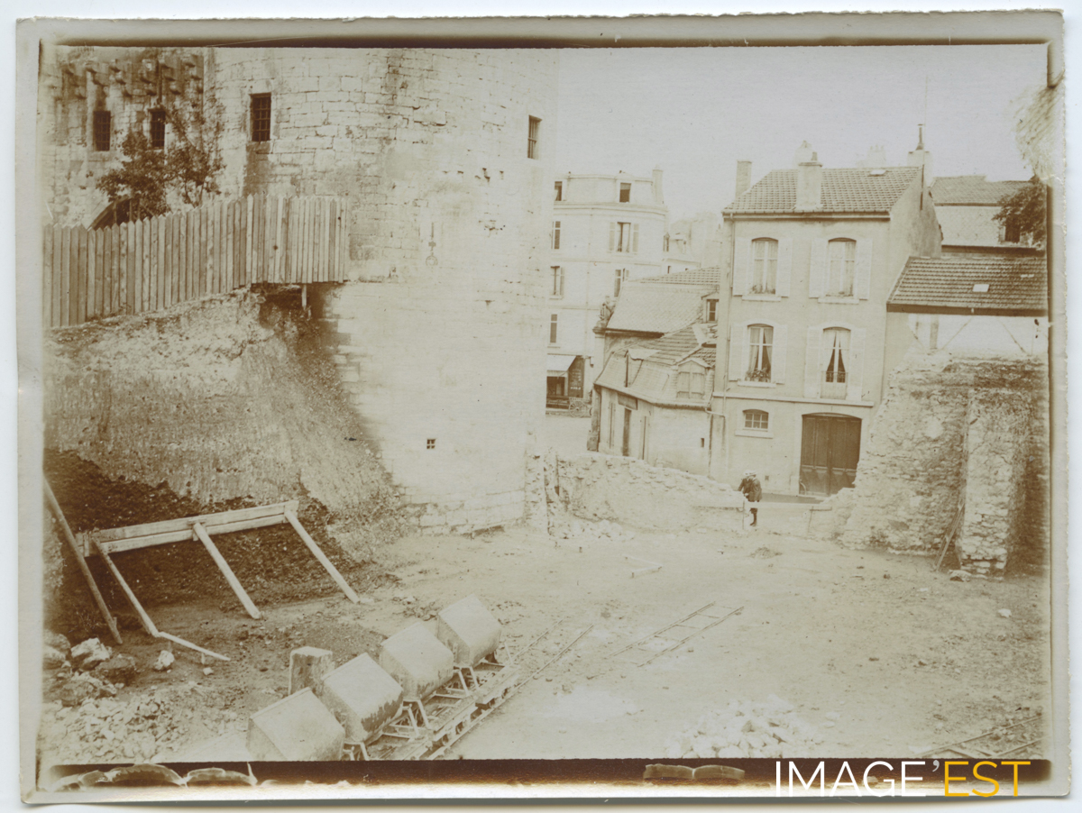 Tour ouest de la porte de la Craffe à Nancy (Meurthe-et-Moselle), le 1er juin 1906. Une mention manuscrite au verso de cette photographie précise : " 1 juin 1906 - 4 - 36 ". Au pied de la tour, mur du rempart donnant sur le bas de la rue de la Craffe.