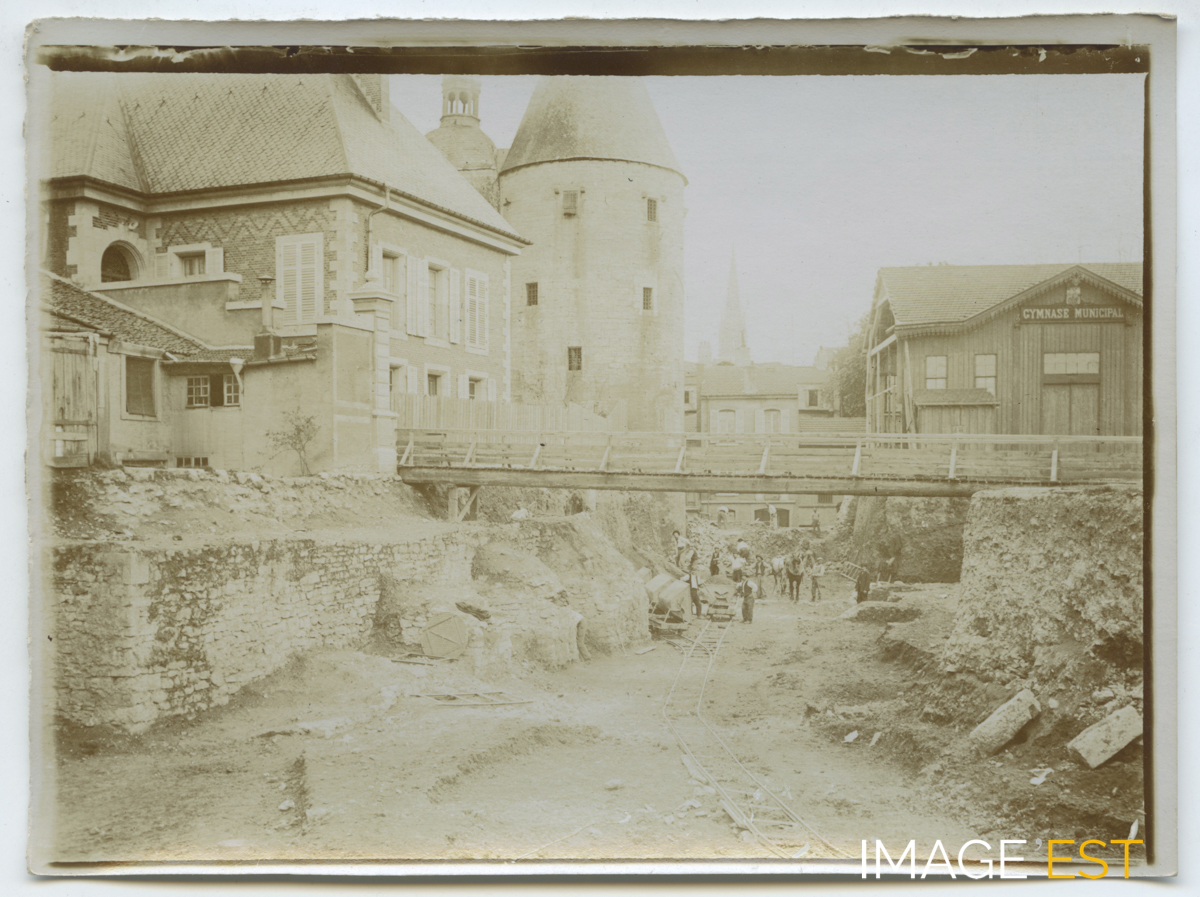 Déblai du réduit et démolition du mur du rempart au pied de la tour ouest de la porte de la Craffe et de l'ancien gymnase municipal à Nancy (Meurthe-et-Moselle), le 3 mai 1906. Une mention manuscrite au verso de cette photographie précise : " 648 - 3 mai 1906 - Travaux de déblai du réduit - au fond commencent des démolitions du rempart - 6 - 4 ". Présence d'ouvriers près du rempart et de rails pour le transport des gravats. Il existe une version plus contrastée de cette photographie avec une mention manuscrite au verso : " 648 - 3 mai 1906 - 4 - 2 -ar ".