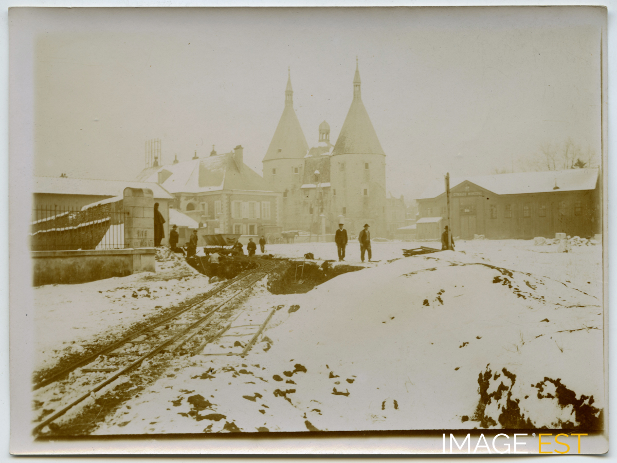 Terrasse enneigée de l'ancien réduit derrière les tours de la Craffe à Nancy (Meurthe-et-Moselle), le 26 janvier 1906. Une mention manuscrite au verso de cette photographie précise : " 624 - 26 janvier 1906 - Commencement des travaux de percement d'une nouvelle rue dans les anciennes fortifications ". À l'emplacement du flan sud démoli du bastion Le Marquis, présence de rails dédiés au transport des gravats pour le percement d'une nouvelle rue au nord-ouest des tours. À l'arrière-plan, on aperçoit les tours de la porte de la Craffe et l'ancien gymnase municipal.