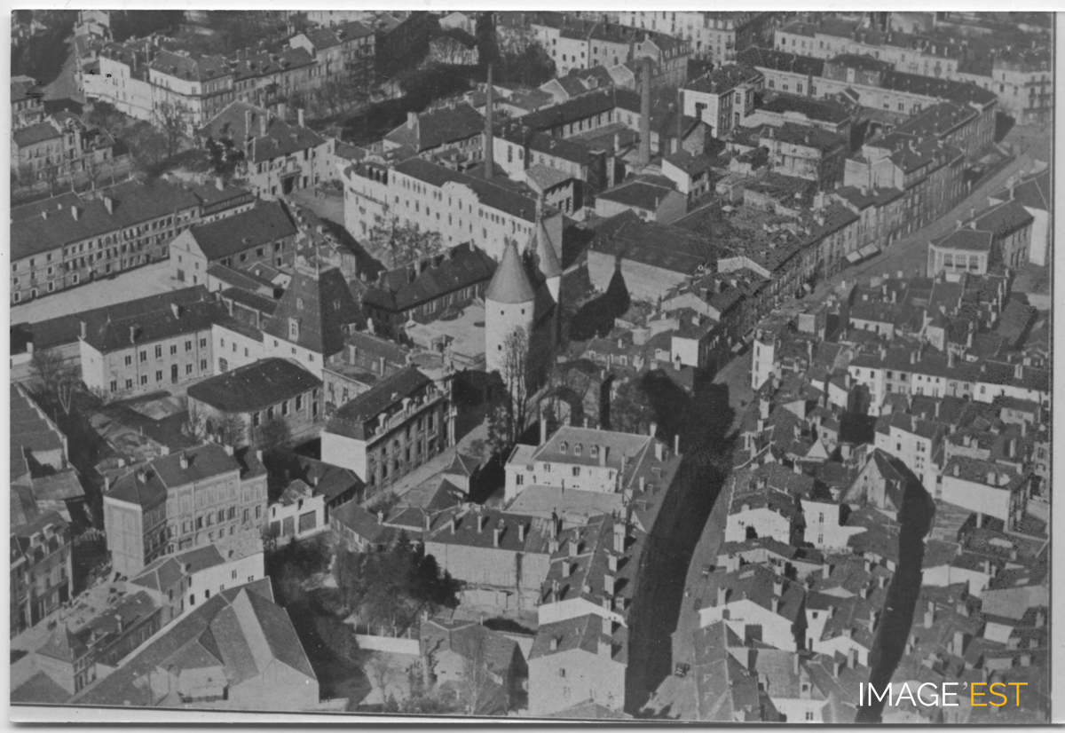 Vue aérienne de la Porte de la Craffe à Nancy (Meurthe-et-Moselle). À l'arrière-plan, l'Institut chimique de Nancy. Sur un autre document identique de grand format, figure l'année " 1930 " au verso.