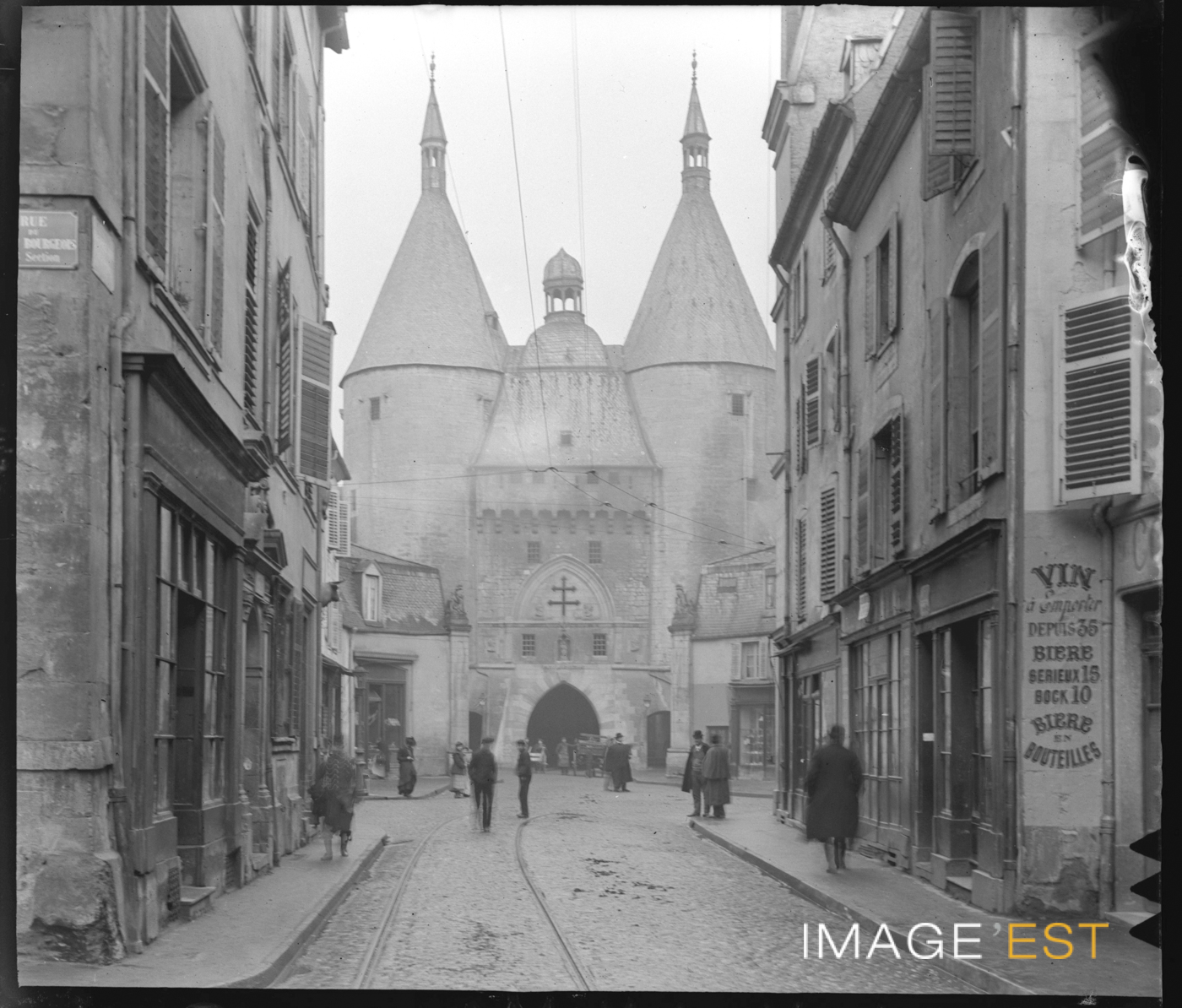 Porte de la Craffe à Nancy (Meurthe-et-Moselle). " Construite au XIVe siècle dans un style résolument gothique, la porte de la Craffe est le dernier vestige de l'enceinte qui entourait le Nancy médiéval. Avant l'édification de la Ville Neuve, cest par celle-ci que les ducs de Lorraine faisaient leur entrée solennelle. Elle est la plus ancienne porte de la ville." (Source : THOMAS, Guillaume. " Paul Michels, les Lorrains en 1900 ", éditions Vent d'Est, 2014, photo page 043).