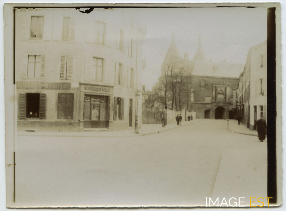 Marchand de vins au rez-de-chaussée d'un bâtiment au croisement de la rue Sellier et de la rue de la Citadelle, au nord-est de la porte de la Craffe à Nancy (Meurthe-et-Moselle), le 18 avril 1900. Une mention manuscrite au verso de cette photographie précise : " 420 - 18 avril 1900 - Voir J.Z. 348.(1904) - La porte de la Craffe - face Nord est rue de la Citadelle - Éclairé sans soleil - sujet difficile à éclairer 2h 1/4 - D = 1 Po = 1 s - ? - (révélateur très allongé - mou) ". On aperçoit les tours de la Craffe à l'arrière-plan.