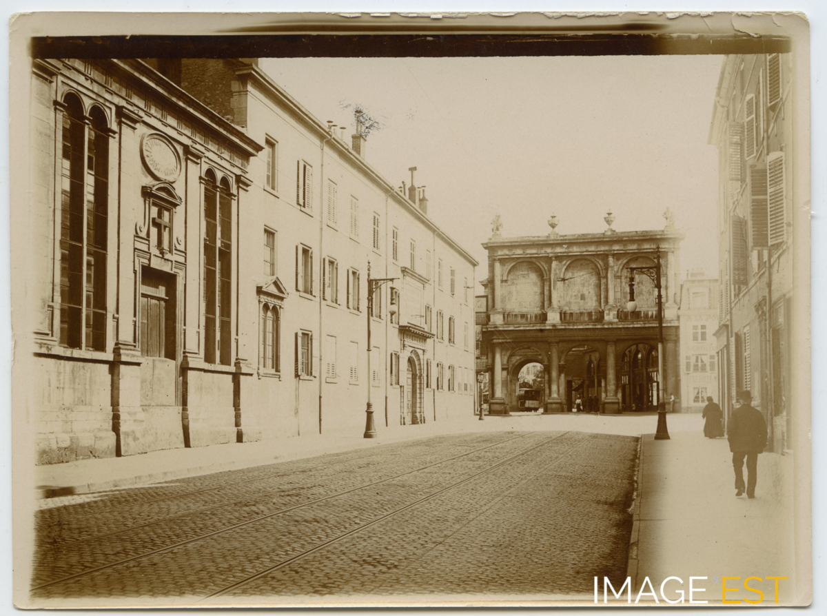 Façade nord de la porte Saint-Nicolas avec, au premier plan de la photographie, sur la gauche, la façade de l'ancienne chapelle du Noviciat des Jésuites située rue Saint-Dizier à Nancy (Meurthe-et-Moselle), le 15 août 1908. Une mention manuscrite au verso de cette photographie précise : " JZ N° 1016 - 15 aout 1908 - La porte St Nicolas - au 1er plan, façade de l'ancienne chapelle des Jésuites désaffectée à la Révolution, et servant aux dépendances de St Stanislas - Bon soleil vers 2h - 0 - I/50 - Nancy - E ".