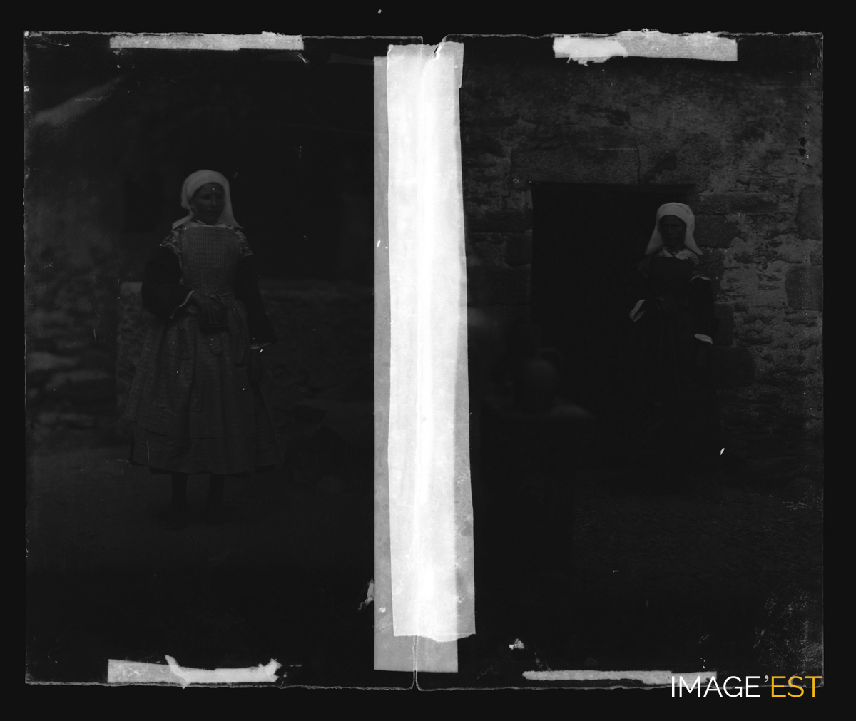 Porteresses posant, probablement à Bourg-de-Batz, devenu depuis Batz-sur-Mer (Loire-Atlantique), photographiées à quelques moments d'intervalle. Deux vues superposées dont la jonction est imparfaite, présente différentes poses des porteuses de sel devant un salorge (petit bâtiment de marais salants servant à abriter les outils et stocker temporairement le sel). Les deux vues exposent les femmes habillées de manière traditionnelle avec un tablier rayé, un mouchoir de cou ainsi que des mouchoirs pour protéger la tête. Photographie sur plaque de verre au collodion attribuée au peintre Eugène Feyen (1815-1908), né à Bey-sur-Seille (Meurthe), probablement réalisée à des fins d'études en vue de la réalisation des oeuvres Les Paludières (vers 1872) et La récolte du sel à Saillé (vers 1875). (Sources : https://www.bro-gwenrann.org/les-costumes / https://www.leguerandais.fr/fr/paludiers/outils-paludier / Christian Debize, Photographes et photographies d'art à Nancy au 19 siècle : Exposition, Nancy, Musée des beaux-arts, 17 juin-5 septembre 1983, p.50-55)