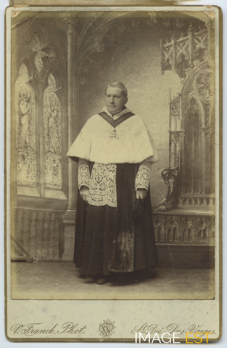 Portrait d'un religieux photographié par Victor Franck. Cette photographie est extraite d'un album contenant des portraits de nombreux prêtres ayant exercés dans le département des Vosges entre 1870 et 1910 environ.