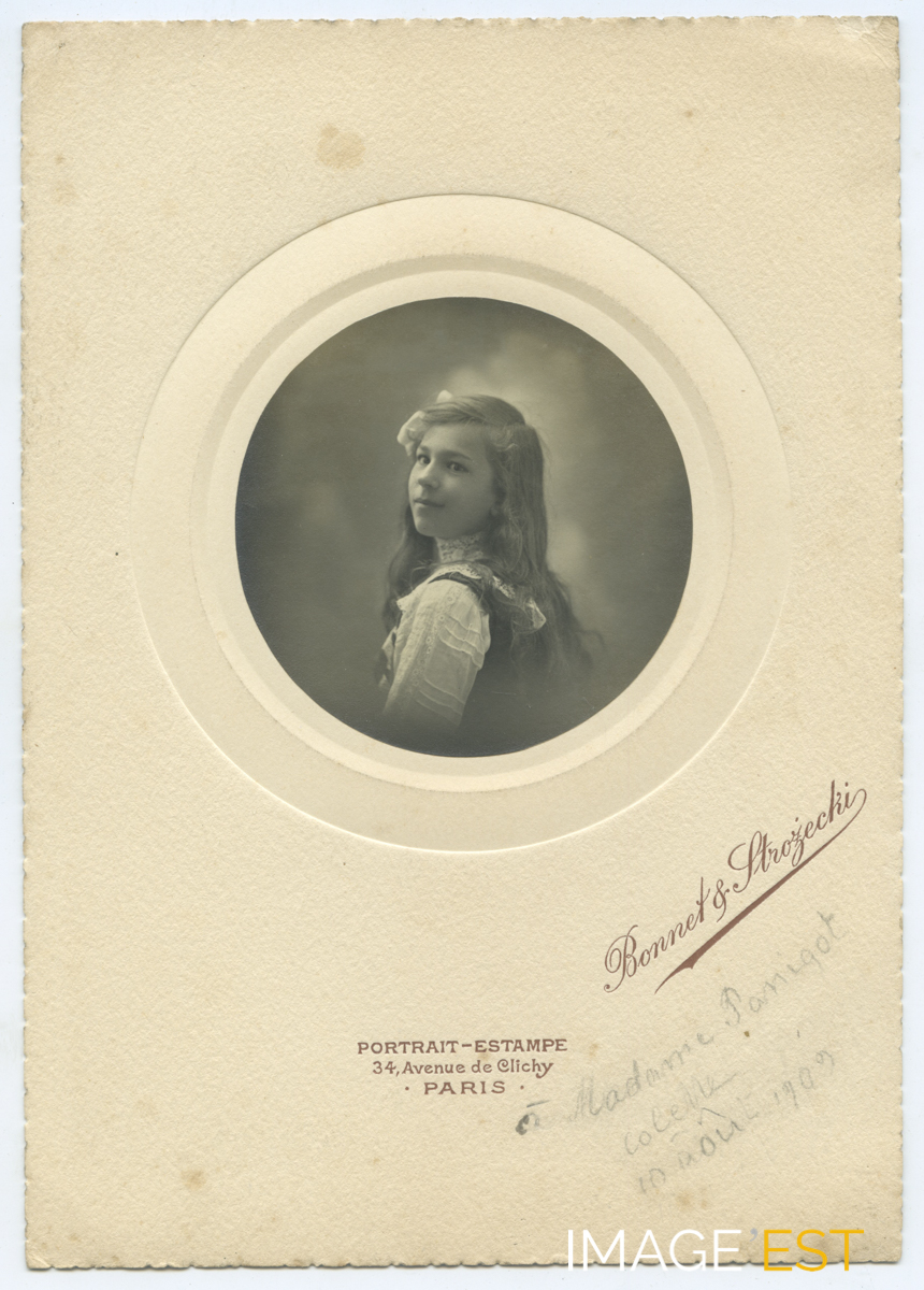 Portrait (ovale) de l'illustratrice, Colette Pattinger enfant (1896-1940?), alors âgée de 13 ans, réalisé par l'atelier de photographie " Bonnet & Strozecki - Portrait-Estampe 34, avenue de Clichy, Paris ". Une inscription manuscrite précise : " Madame Panigot, Colette 10 août 1909 ".