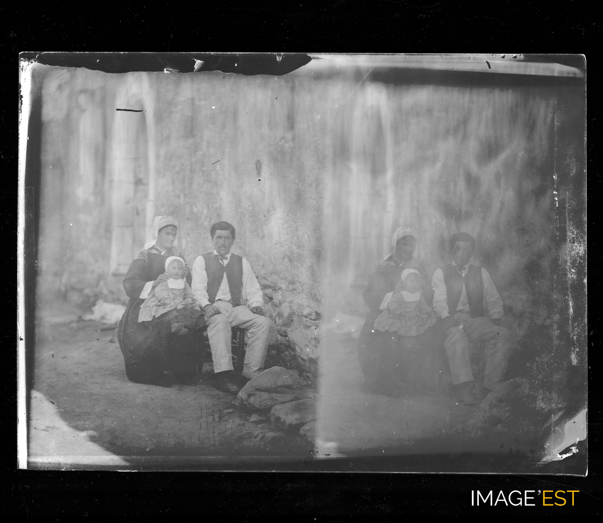 Famille paysanne, probablement à Bourg-de-Batz, devenu depuis Batz-sur-Mer (Loire-Atlantique), photographiée à quelques instants d'intervalle. Deux vues superposées dont la jonction est imparfaite révèlent deux poses de la famille. Les deux vues exposent un homme, une femme et un enfant assis posant pour le photographe, toutefois la vue de droite apparaît voilée. Photographie sur plaque de verre au collodion attribuée au peintre Eugène Feyen (1815-1908), né à Bey-sur-Seille (Meurthe).