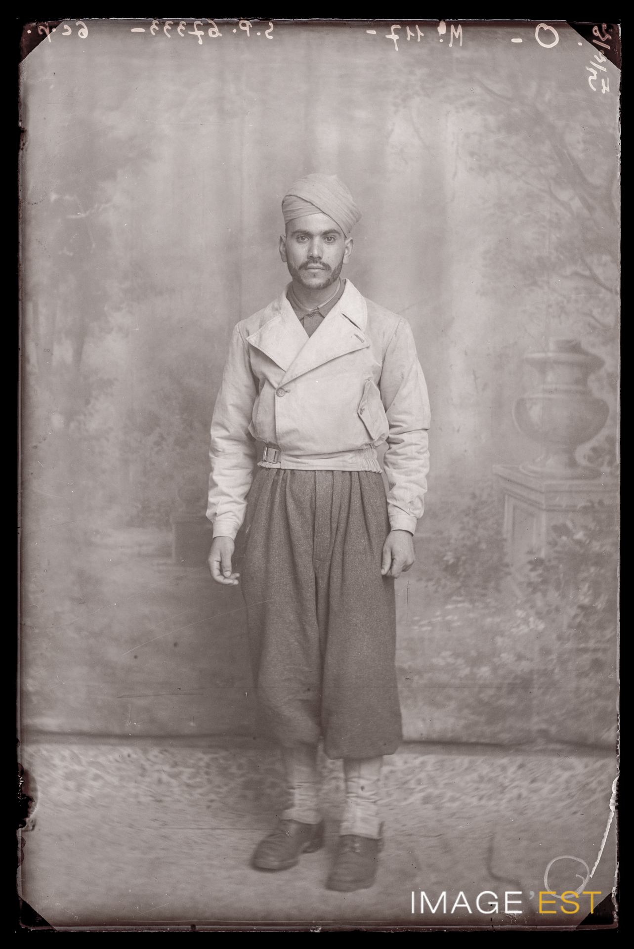 Portrait en pied d'un goumier marocain photographié le 20 février 1945 dans le studio du photographe Léo Durupt (1900-1966) au Val-d'Ajol (Vosges). Une mention manuscrite originale figurant sur la plaque de verre précise : " 20/2/45 - O - Me 117 - S.P. 67333 - 6 c.p. ".