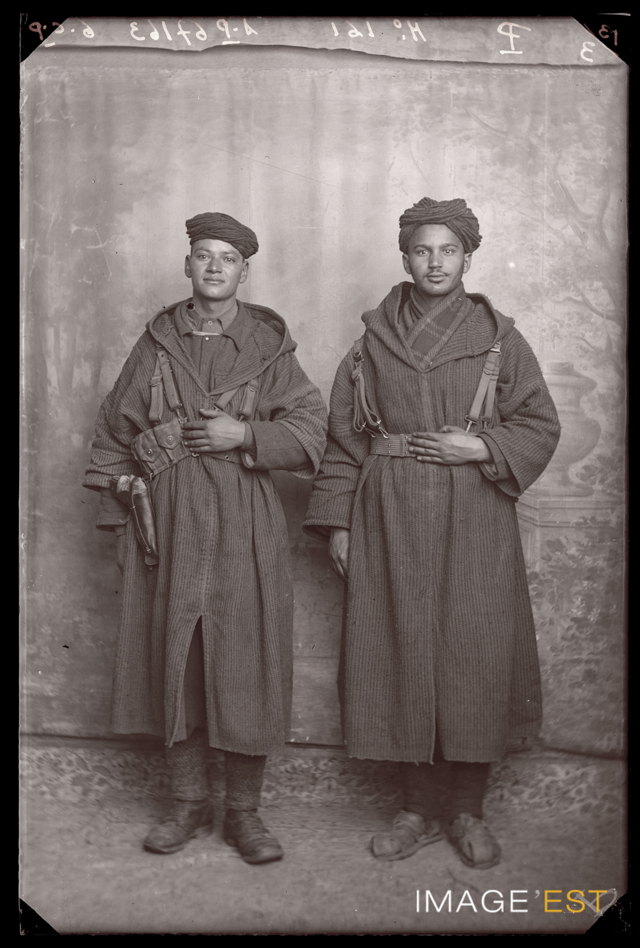 Portrait en pied de deux goumiers marocains photographiés dans le studio du photographe Léo Durupt (1900-1966) au Val-d'Ajol (Vosges). Une mention manuscrite originale figurant sur la plaque de verre précise : " 13/3 - P - Me 161 - S.P. 67163 - 6 c.p. ".