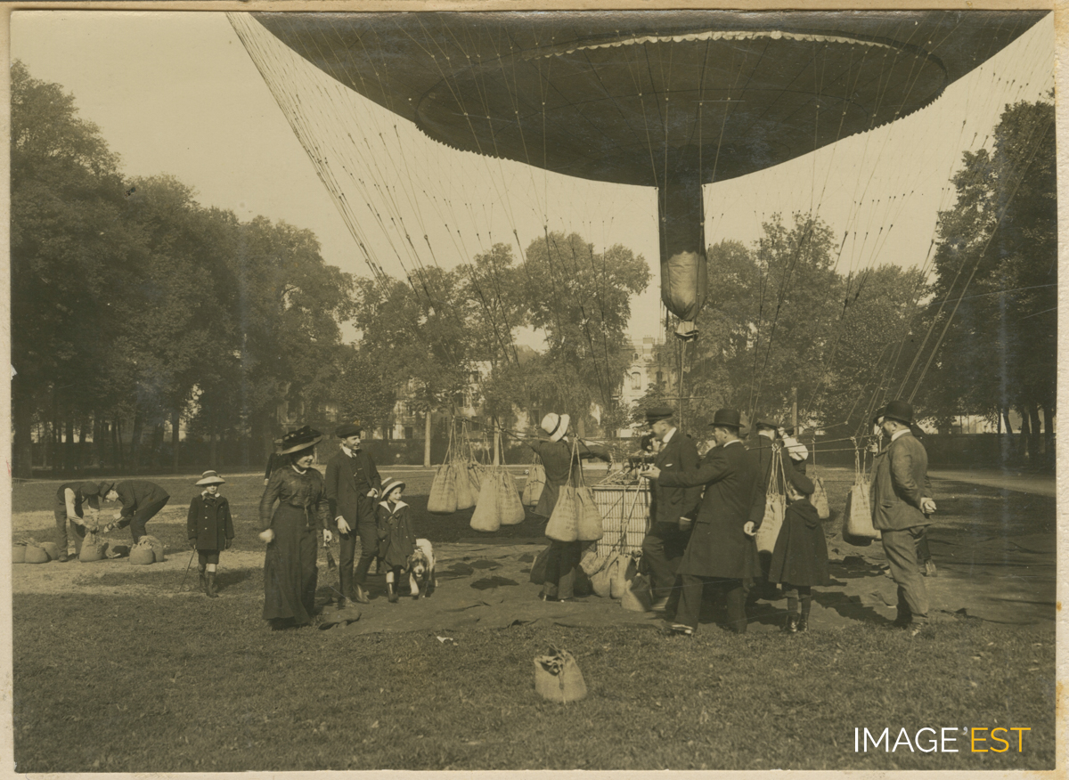 Préparation d'un envol de ballon (voir article de L'Est Républicain du 5 octobre 1910) au parc de la Pépinière à Nancy (Meurthe-et-Moselle). À gauche, Berthe Kalis (1876-1947), accompagnée de ses enfants, Robert et Geneviève, et de son plus jeune beau-frère, Paul Kalis (1880-1914) entrepreneur de plâtrerie. (Source : Archives privées des familles Kalis-Moreau).