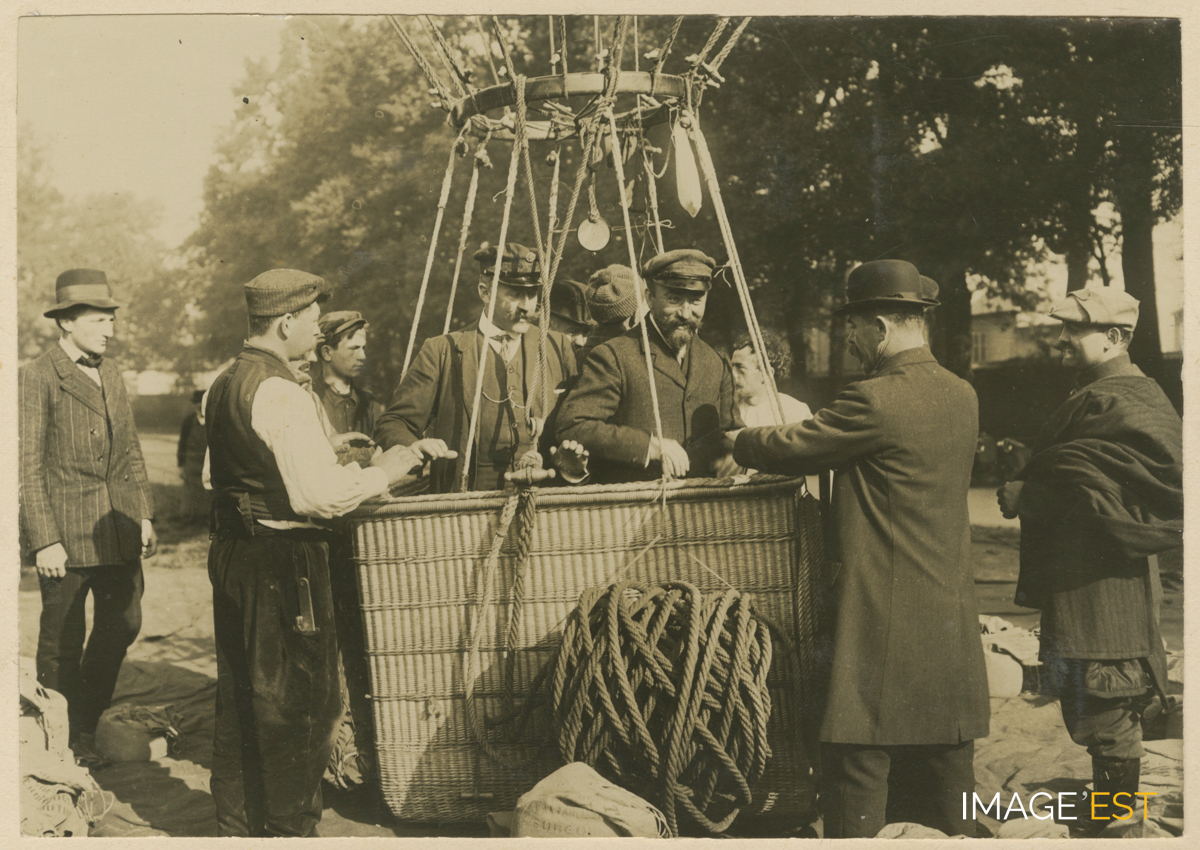 Préparation d'un envol de ballon (voir article de L'Est Républicain du 5 octobre 1910) au parc de la Pépinière à Nancy (Meurthe-et-Moselle). Dans la nacelle, Louis Kalis (1874-1939) entrepreneur de travaux publics et Paul Moreau (1879-1933), brasseur. De dos, coiffé d'un bonnet en laine, Antonin Bergeret (1893-1983) étudiant. (Source : Archives privées des familles Kalis-Moreau).