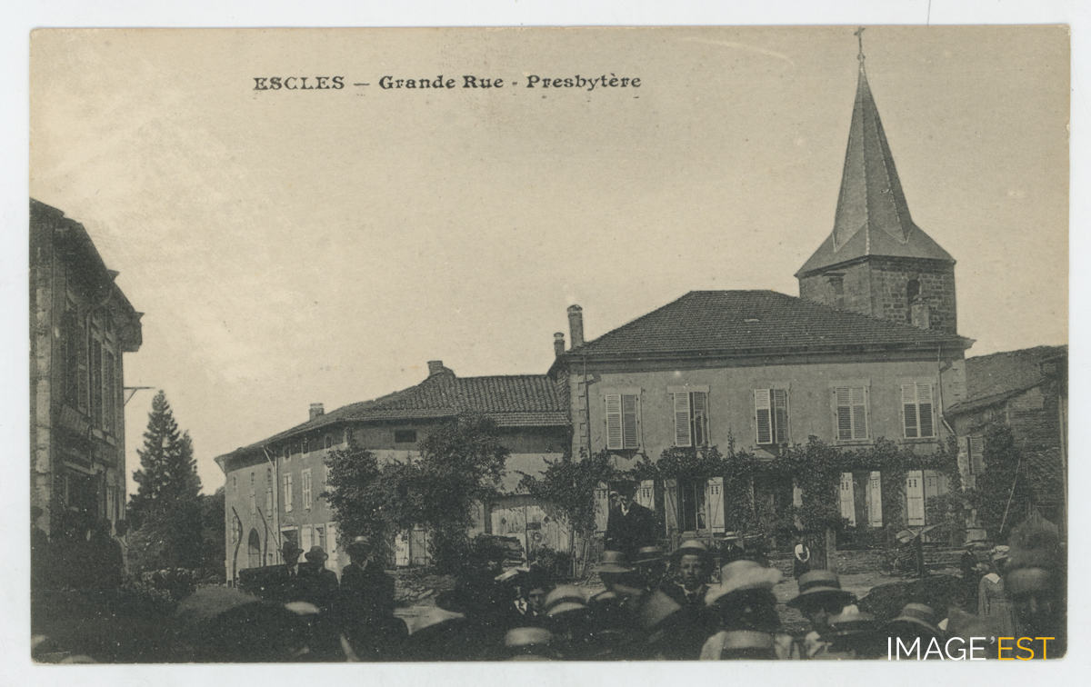 Presbytère et église à Escles (Vosges). À droite, le clocher de l'église Saint-Étienne derrière le presbytère.