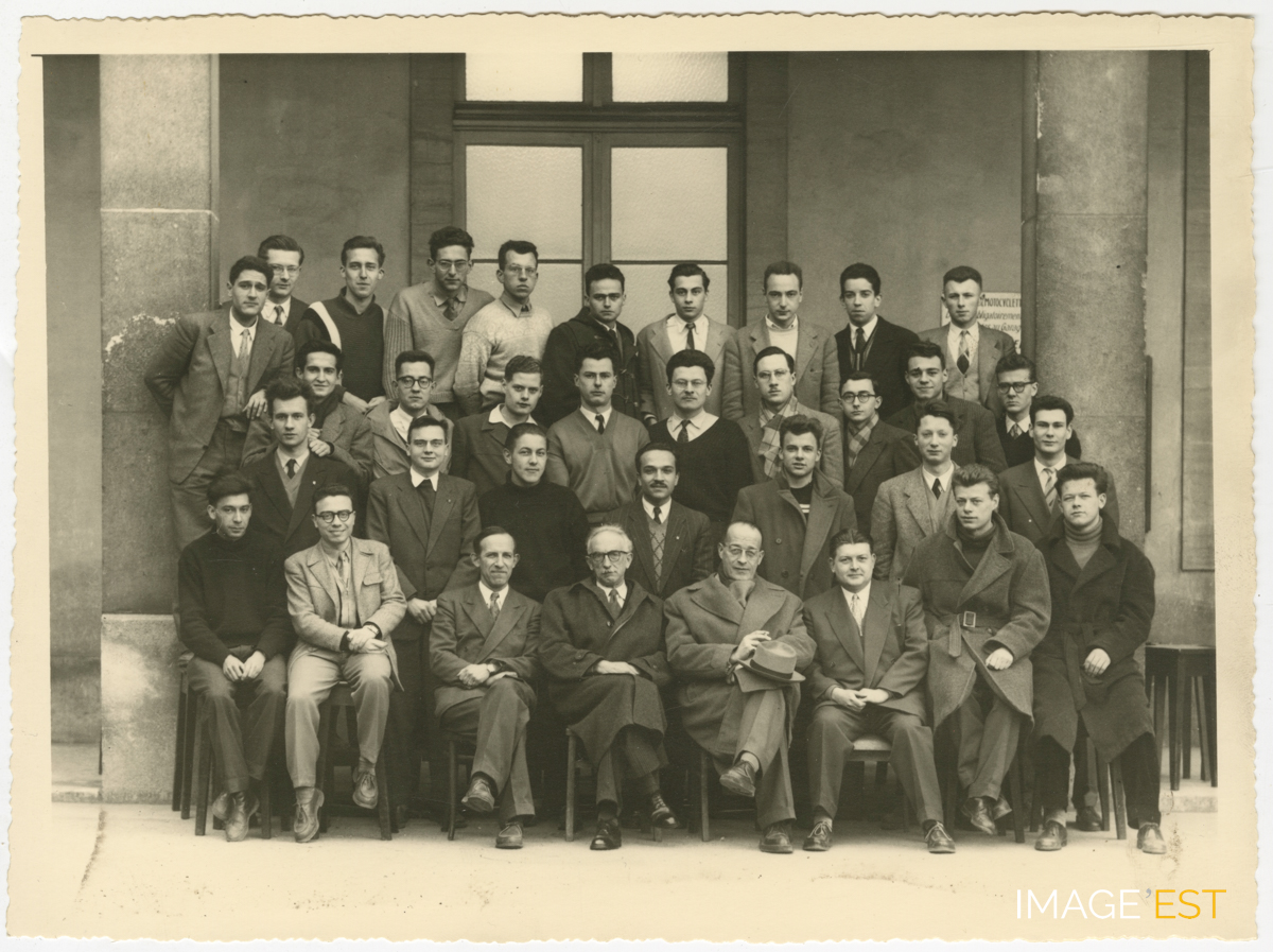 Promotion d'étudiants de l'ENSIC (École nationale supérieure des industries chimiques) à Nancy (Meurthe-et-Moselle). En partant du haut et de gauche à droite : 1er rang : HAGEGE, Raoul - CORDIER Yves - LETEURTRE, Jean - VERGNE, Jean - BACQUE, Jean-Pierre - LESPINASSE, Bernard - LEROY, Jacques - PARIS, Jean - PICOT, André - GERMAIN, Bernard ; 2e rang : GENOT, Marc - LE PAGE Joël - DEMANGE, Michel - DECHENEAUX, Victor - ALLARD, Pierre - REGNAULT, Jacques - GIOLITO François - JOANNES Paul - DOUSSAINT, Jean-Marie ; 3e rang : SZYKULLA, André - VILLERMAUX, Jacques - MULLER, Jean-Claude - MAJOUBE, Michel - ZIMMERMANN, André - MARTIN Charles - CASSUTO, Albert ; 4e rang (assis) : COMBES, André - AMARIGLIO, Henri - AUBRY, Jaques (enseignant) - CORNUBERT, Raymond (enseignant) - LETORT, Maurice (enseignant) - BASTICK, Jacques (enseignant) - DELAHAYE, Jean - SYLVESTRE, Roland. Absents sur la photo : Michel Goudot et Gérard Wuillaume.