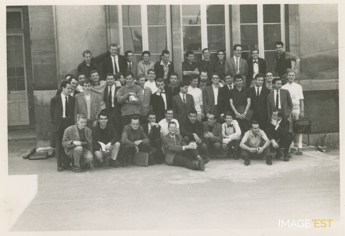 Promotion 1967 d'étudiants et d'étudiantes de l'ENSIC (École nationale supérieure des industries chimiques) à Nancy (Meurthe-et-Moselle). Une mention manuscrite au verso précise : " Promo 1965 ".