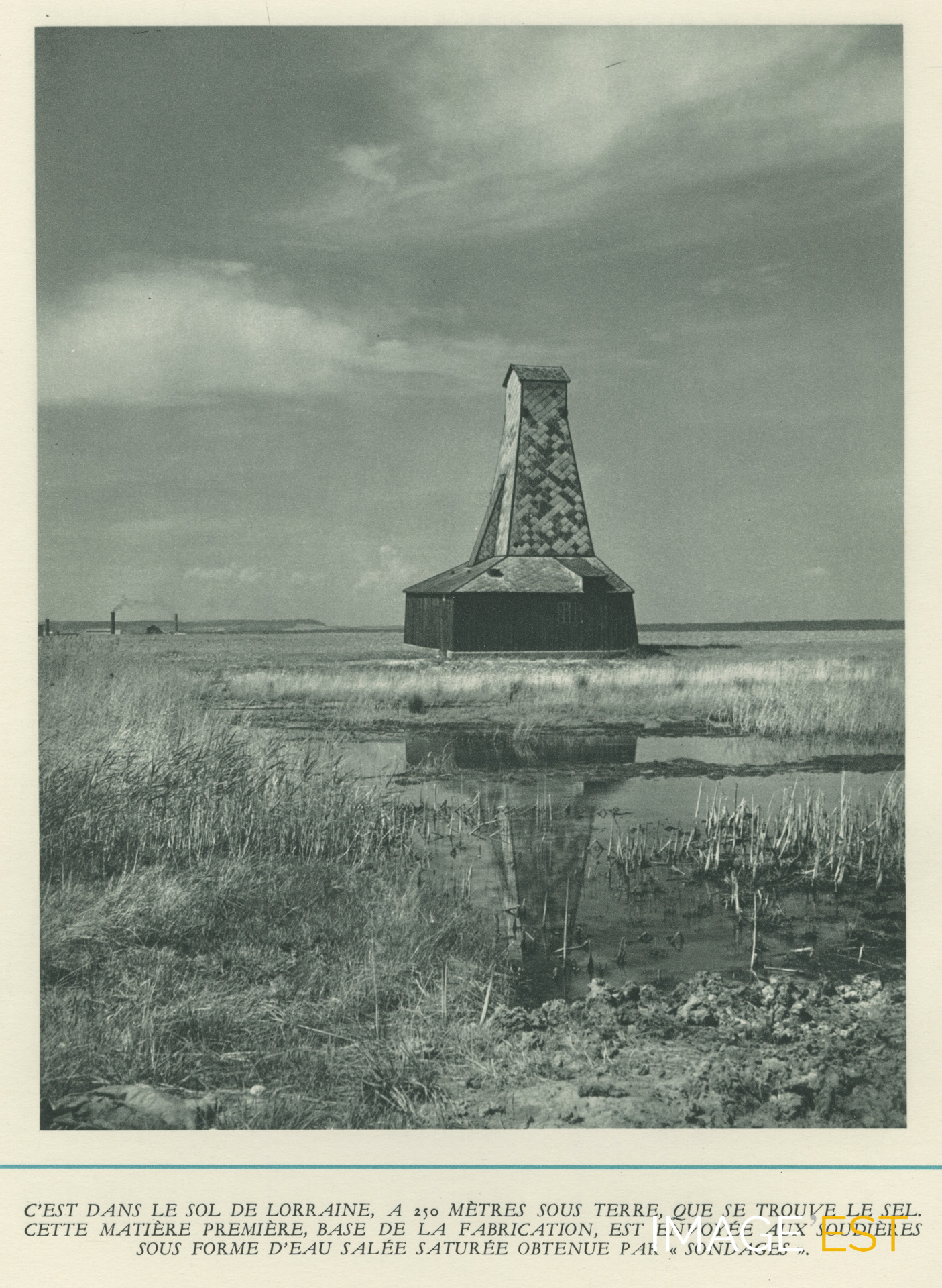 Puits de sondage de sel à Laneuveville-devant-Nancy (Meurthe-et-Moselle). Cette héliogravure est extraite d'une plaquette intitulée, Les soudières réunies : 1855-1955, conçue et éditée à l'occasion du centième anniversaire de la Société du Comptoir de l'Industrie du Sel et de la Saline de Saint-Nicolas-Varangéville (Daguin et Cie).