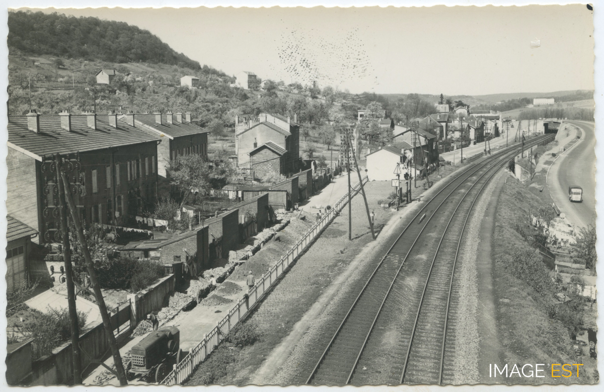 Voies ferrées de la ligne Paris-Strasbourg et travaux de voirie quai Gambetta à Maxéville (Meurthe-et-Moselle). À droite, la RN57 passant sur le pont Fleuri en direction de Champigneulles.