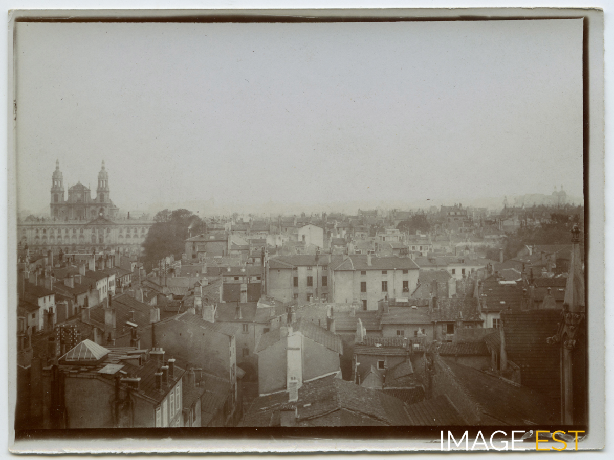 Vue sur les toits prise depuis la galerie haute de la basilique Saint-Epvre avec, à l'arrière-plan, l'hôtel de ville et la cathédrale Notre-Dame-de-l'Annonciation à Nancy (Meurthe-et-Moselle), le 17 août 1908. Une mention manuscrite au verso de cette photographie précise : " JZ 1020 - 17 8 1908 - (b) Vue prise de la galerie haute au-dessus du ch½ur de St Epvre - temps légèrement embrumé - Nancy - ? ultra - E ". Le verso de la photographie présente aussi un croquis, peut-être une représentation, avec quatre flèches d'orientation, depuis la galerie haute de la basilique Saint-Epvre.