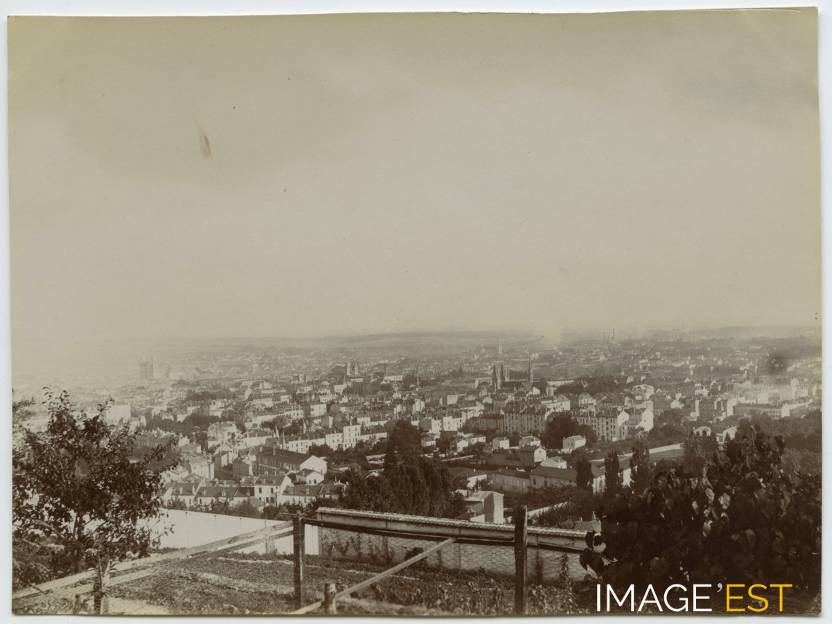 Panorama de Nancy avec vue sur les quartiers Saint-Léon et Saint-Sébastien à Nancy (Meurthe-et-Moselle). Une mention manuscrite au verso de cette photographie précise : " 381 ". On aperçoit sur la gauche de la photographie la cathédrale Notre-Dame-de-l'Annonciation.