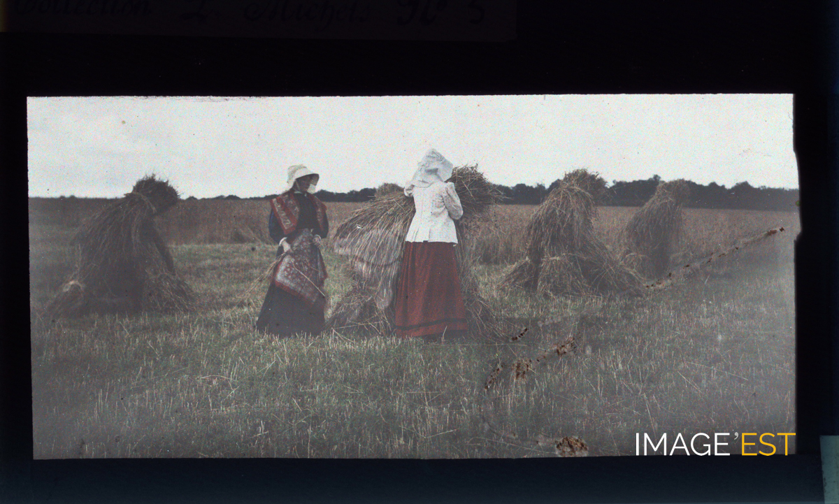 Ramasseuses de foin dans un champ probablement en Meurthe-et-Moselle. Au centre de la composition, de dos, la première femme est coiffée un large bonnet blanc couvrant sa tête ainsi que son visage, et porte une veste blanche ainsi qu'une jupe longue rouge avec un liseré noir sur le bas. Elle souleve une meule de foin. La seconde femme est coiffée d'un large bonnet blanc et vêtue d'un chemisier et d'une jupe longue bleu foncé. Aucune mention manuscrite en marge de la plaque de verre autochrome.