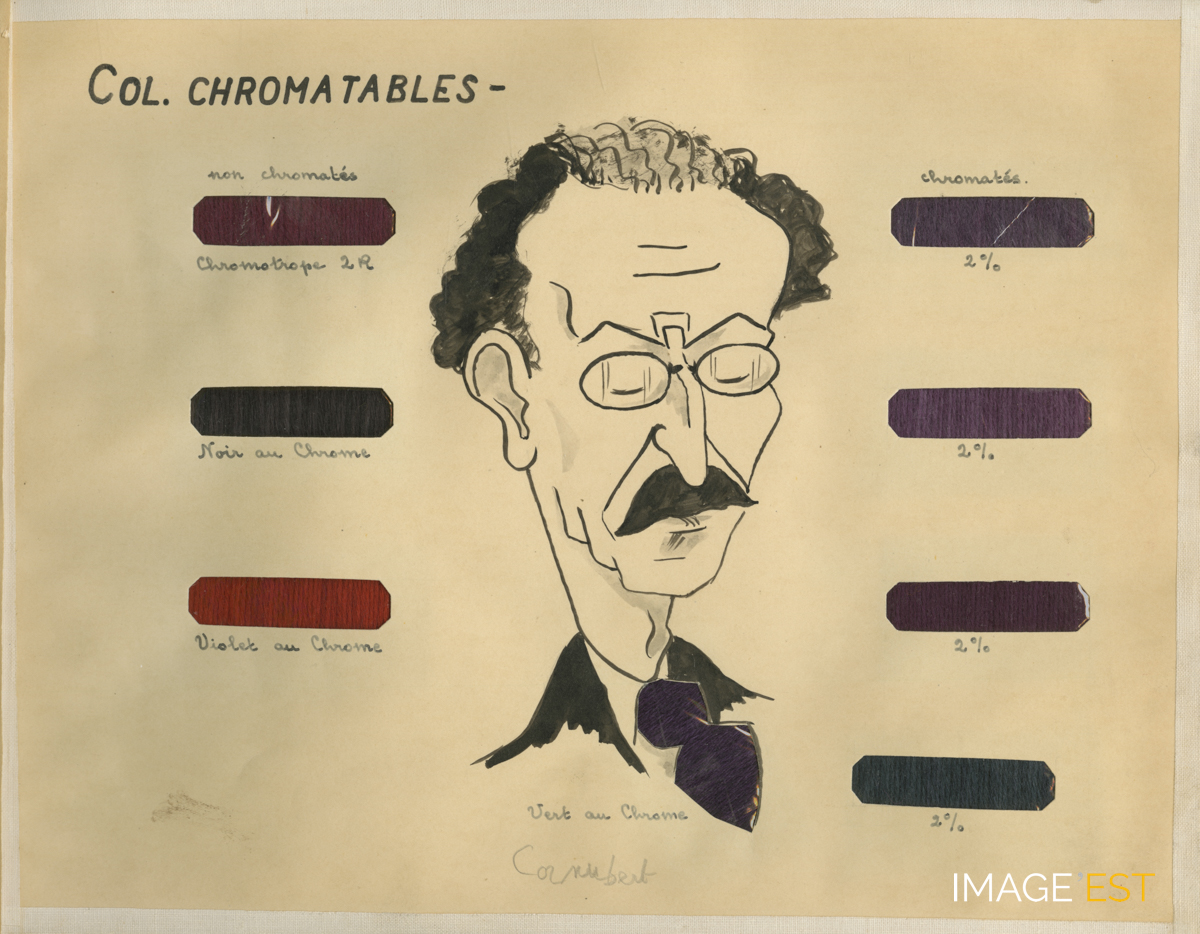 Caricature de Raymond Cornubert (19..-19) enseignant à l'École Nationale supérieure des Industries Chimiques à Nancy (Meurthe-et-Moselle). Cette planche est extraite de l'album intitulé " Teintures - Impressions, J. S. Dahl ", issu des collections de l'École nationale supérieure des industries chimiques (ENSIC) de Nancy à Nancy (Meurthe-et-Moselle). Sur ce portrait, l'accent est porté sur une couleur, " Vert au chrome " qui colore une cravate portée. Il s'agit à la base d'un morceau de tissu imbibé d'un acide pour obtenir cette couleur. Selon le poucentage utilisé (Non chromaté - Chromotrope 2 R, Noir au Chrome, Violet au chrome 1%), les couleurs se nuancent de gauche à droite. Le pourcentage passe à 2% pour les extraits chromatés. La composition repose à la base sur une page cartonnée épaisse où sont contrecollés des morceaux de tissus. Sur une seconde page cartonnée a été dessinée la caricature, avec de part et d'autre du visage, de petites ouvertures rectangulaires, pratiquées sur le papier, valorisant les couleurs des tissus. Une mention manuscrite au crayon précise : " Cornubert ".